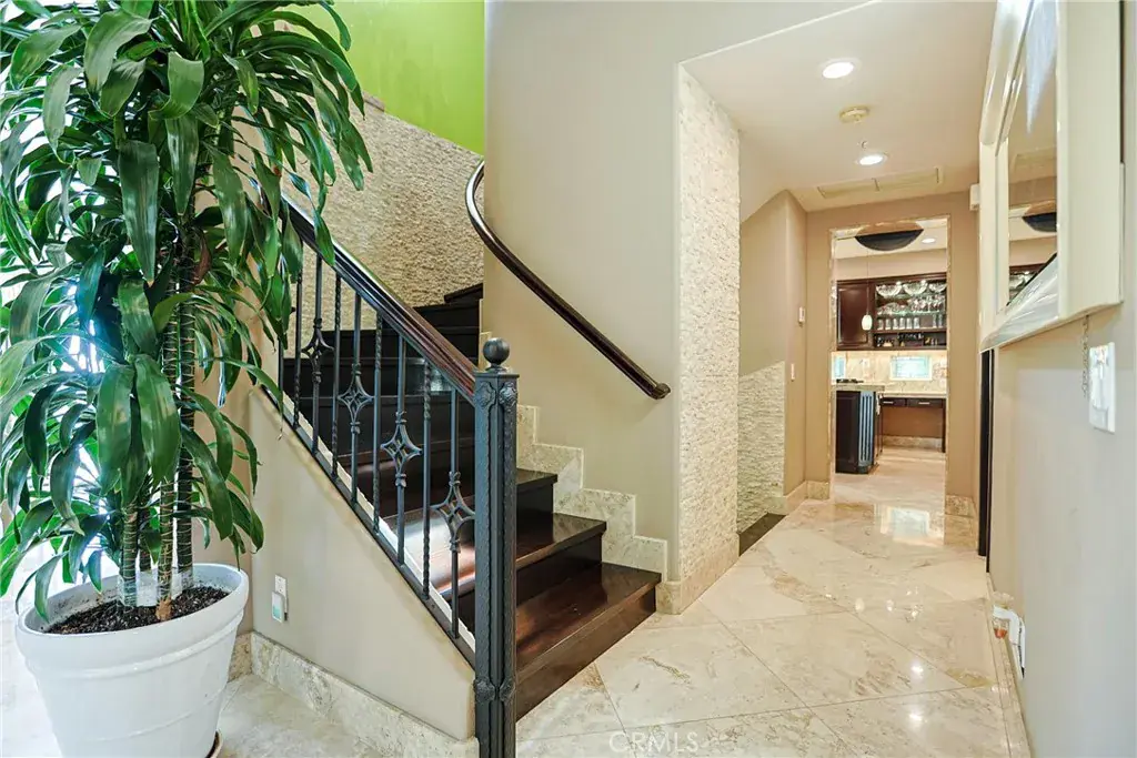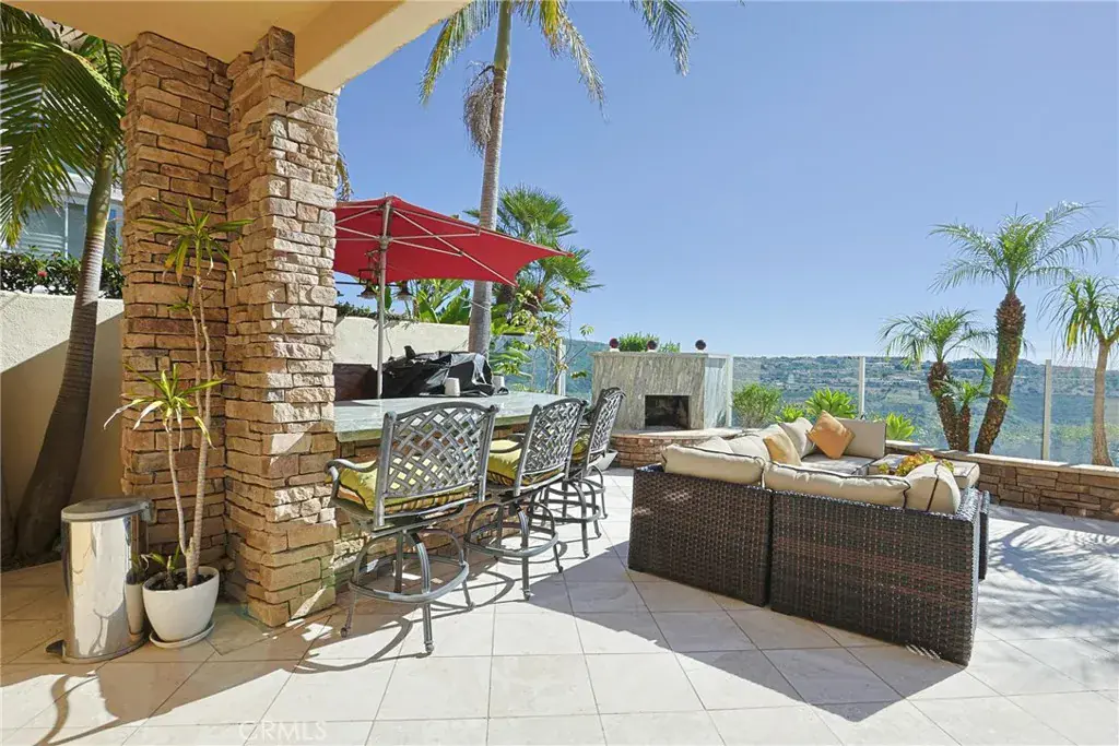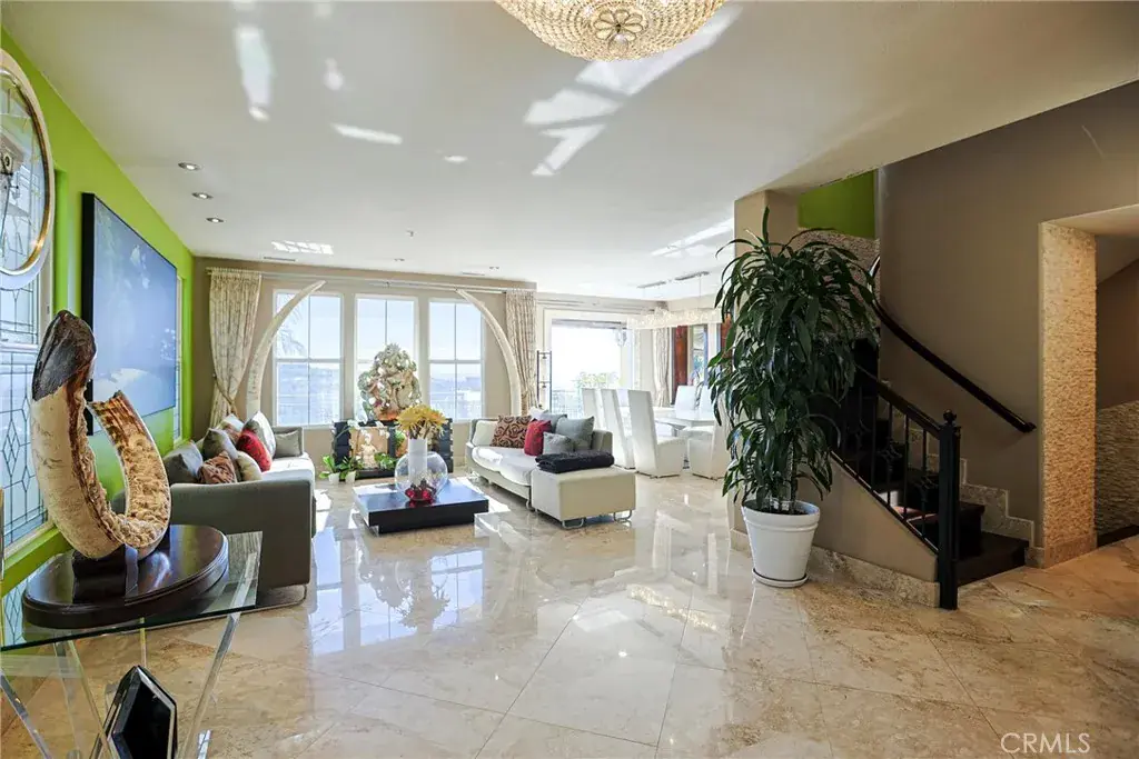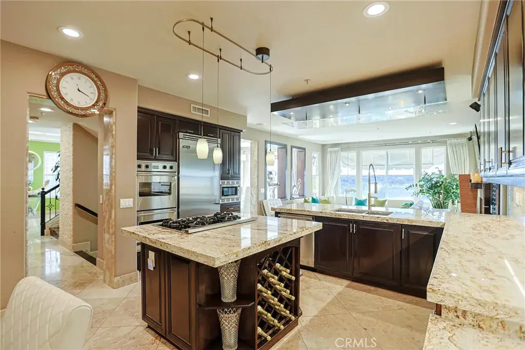 Spanning approximately 3,864 sq. ft., the largest floor plan in the community, the residence features 3 bedrooms and 3.5 bathrooms designed for refined living and effortless entertaining. Elegant interiors showcase a dramatic Laos redwood staircase, marble flooring with marble baseboards, wood floors, recessed lighting, and custom designer finishes throughout. The gourmet kitchen is appointed with marble countertops, rich dark cabinetry, a center island, and top-of-the-line Viking stainless steel appliances, opening to a light-filled great room with sweeping views of Crystal Cove and the Pacific Ocean.