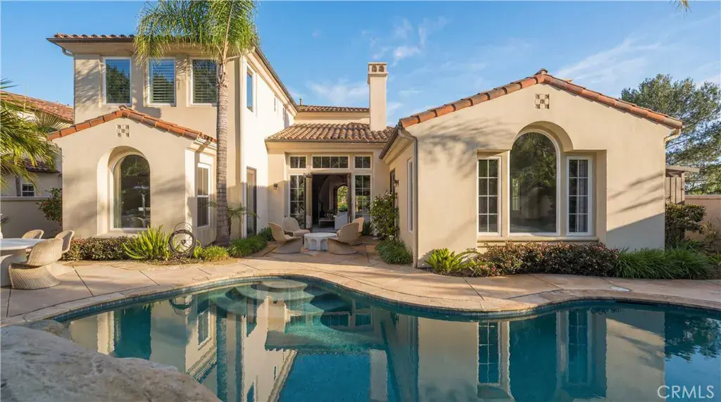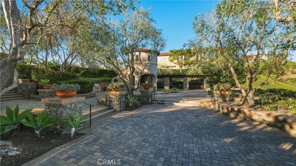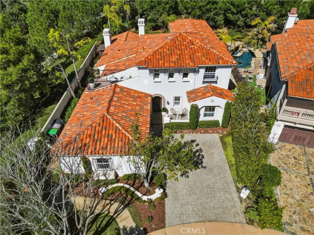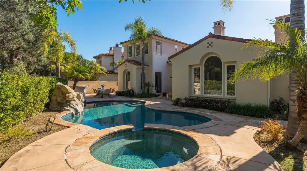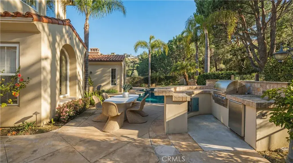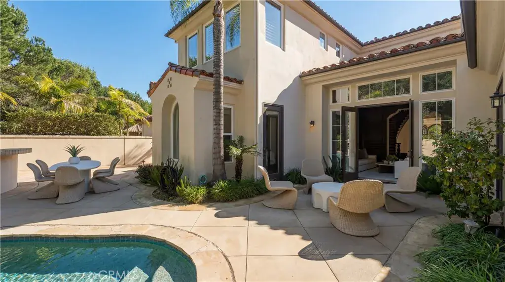 Set within the prestigious guard-gated Coastal Canyon enclave of Sausalito, this thoughtfully upgraded residence is ideally positioned at the end of a quiet cul-de-sac, offering enhanced privacy and a peaceful setting surrounded by open green spaces. The expansive, light-filled floor plan features four generously sized bedrooms, four full bathrooms, powder room, dedicated office, and a spacious bonus room. Designed for seamless indoor-outdoor living, the main living areas open to multiple entertaining patios, a custom built-in bar and barbecue area, and a private resort-style pool and spa—creating an inviting environment for both everyday living and gatherings. An upper-level deck provides tranquil ocean views and additional outdoor space to relax and unwind. Interior upgrades include travertine flooring throughout much of the main level, new carpet, custom crown moldings, extensive woodwork, and fresh interior paint throughout. The gourmet kitchen is appointed with Viking and Sub-Zero appliances, granite countertops, ample cabinetry, and opens directly to a spacious great room ideal for entertaining and casual living. The home is complete with a main-level primary suite and a secondary guest bedroom, offering exceptional convenience and flexibility for guests or multi-generational living. The property offers both tranquility and convenience, just moments from premier shopping, world-class dining, and Southern California’s finest beaches.