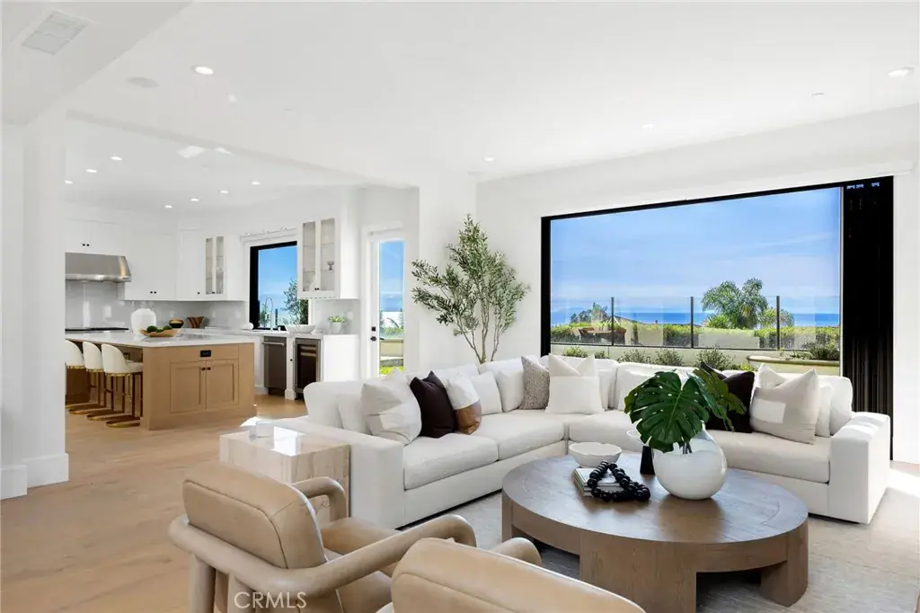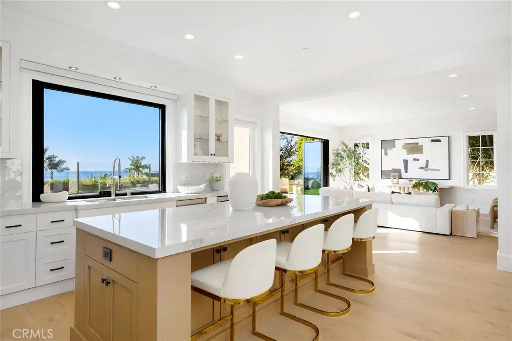 A dramatic two-story foyer welcomes you with soaring ceilings and a gracefully curved staircase. The open-concept great room, dining area, and family space flow effortlessly together, framed by a wall of glass that captures the Pacific horizon. The designer kitchen is a true centerpiece — featuring a porcelain-slab island, Wolf 6-burner range with dual ovens and grill, wine cooler, and custom cabinetry — blending both beauty and functionality.