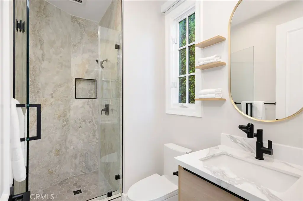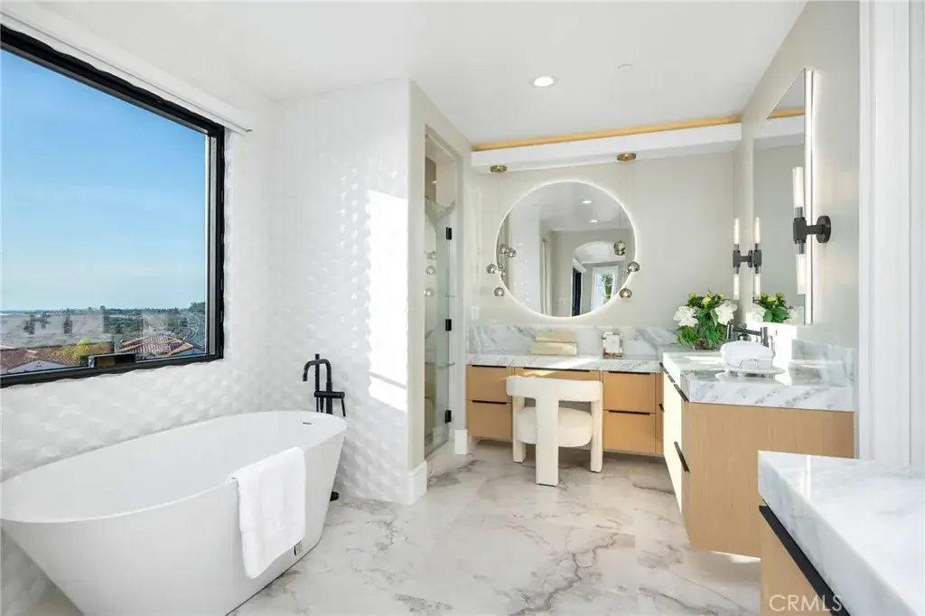 Two main-level bedroom suites provide flexibility for guests, a home office, or fitness space. Upstairs, the primary retreat offers resort-style living with a private terrace overlooking white-water views to Palos Verdes. The spa-like bath includes dual vanities, a soaking tub, makeup station, and a generous walk-in closet illuminated by natural light.