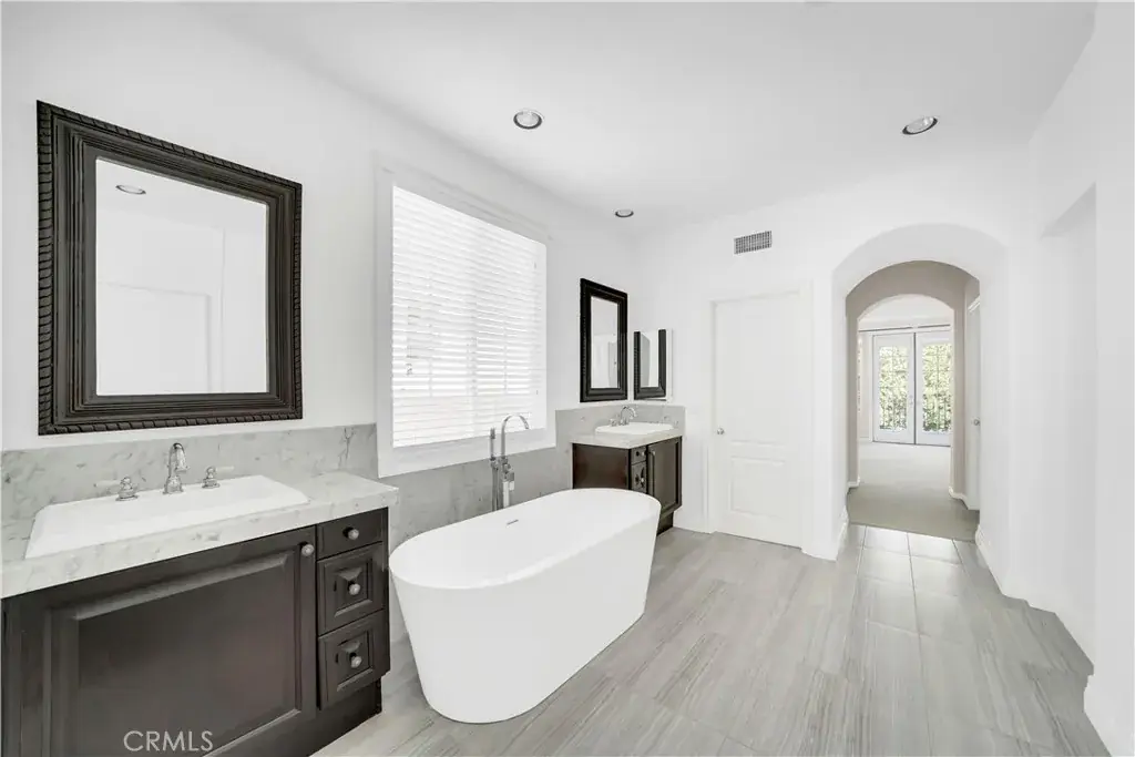Upstairs, the luxurious primary suite offers a serene retreat with French doors opening to a large private balcony. The elegant primary bathroom includes dual quartz vanities, a soaking tub, a marble walk-in shower, and dual walk-in closets.