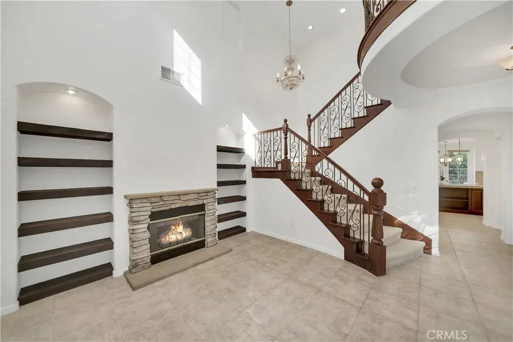 An impressive living room showcases soaring ceilings and a cozy fireplace, while the formal dining room features French doors opening to a charming private courtyard, ideal for entertaining. A striking wrought-iron staircase leads to the upper level.