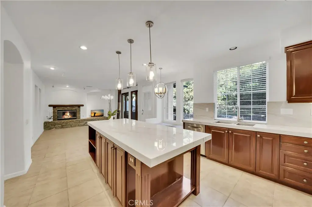 The gourmet, highly upgraded kitchen features stunning quartzite countertops, stainless steel appliances, and a built-in breakfast nook. A custom center island opens seamlessly to the spacious family room, complete with a stone fireplace and bi-fold French doors that lead to a beautifully landscaped, private backyard perfect for indoor-outdoor living.