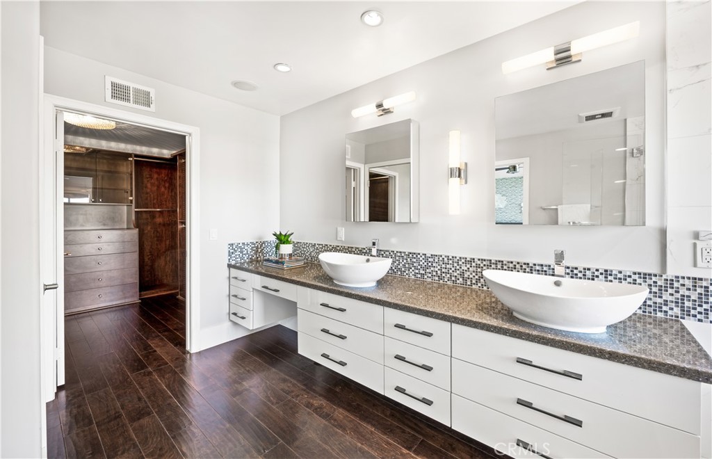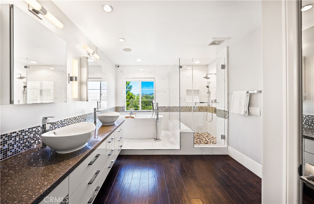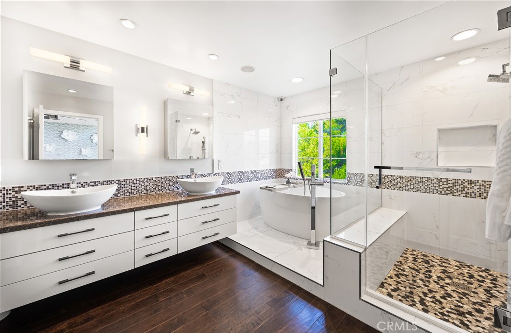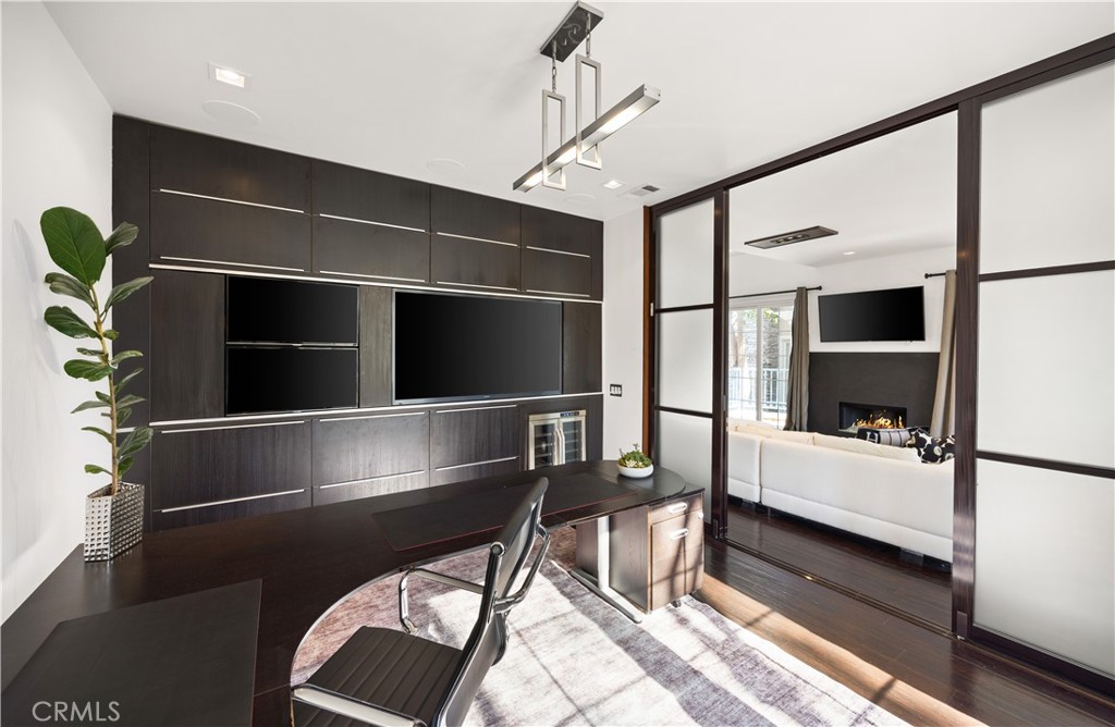 The kitchen and dining area flow seamlessly to a private rear-yard oasis framed by mature hedge trees for enhanced privacy, complete with a water feature, gas BBQ, and hot tub overlooking the canyon. Custom Bali privacy blinds in the kitchen and dining area allow natural light while maintaining privacy. A separate main-level office, divided by custom sliding glass doors, provides an ideal work-from-home setup.