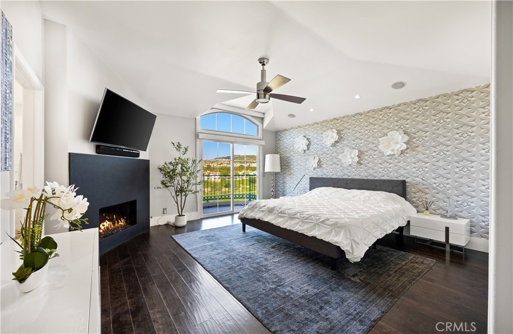 Upstairs, the primary retreat features a gas fireplace, private balcony with canyon views, dual closets, and Hunter Douglas custom motorized blinds with sheer and blackout options. The spa-like primary bath includes marble wall tile, soaking tub, walk-in shower, and dual-sink cabinetry with seated vanity. Two additional bedrooms and a full bath complete the floor plan.
