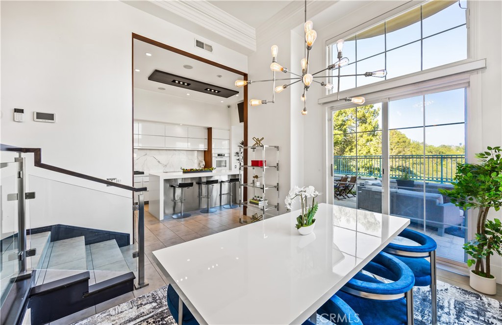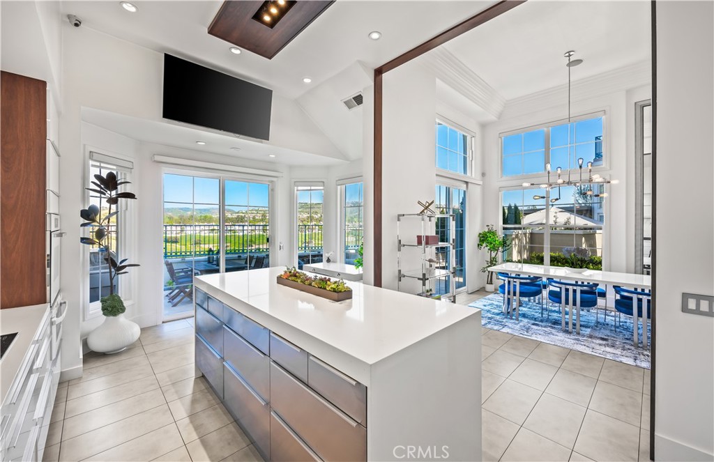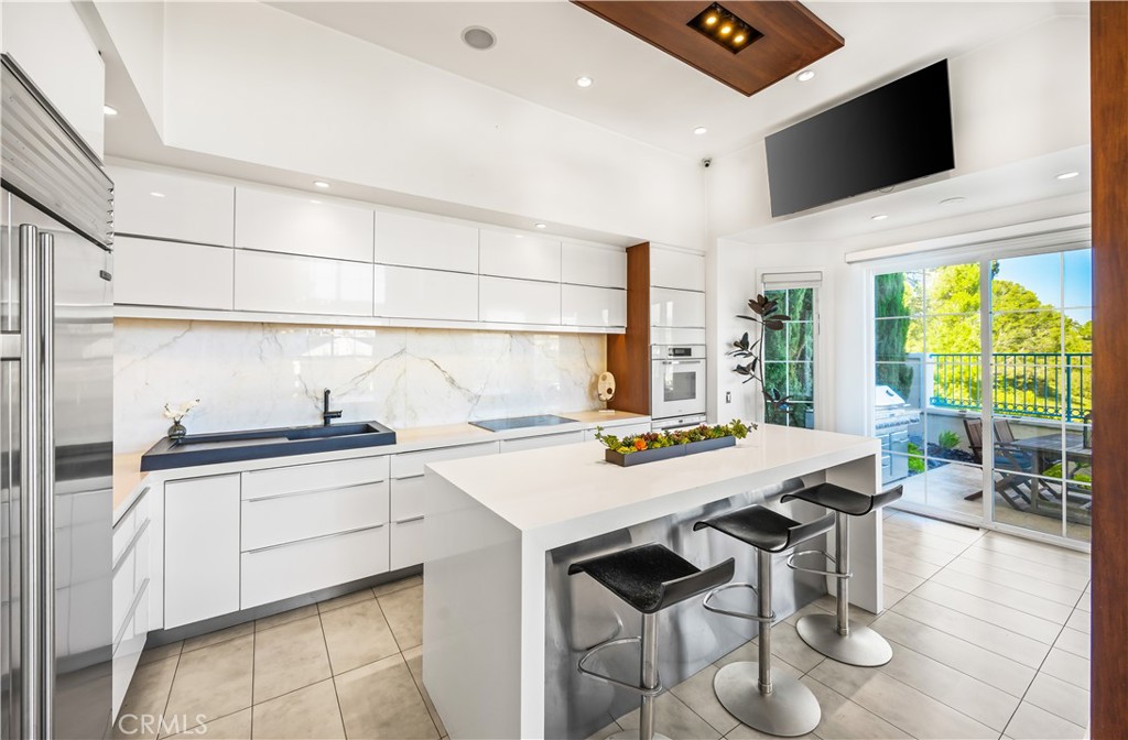 The exceptionally large, double-sized kitchen—a significant upgrade over the original half, L-shaped kitchens in the community—is a gourmet showpiece featuring 16-foot ceilings and tranquil canyon views. Designed for everyday living and entertaining, it offers high-gloss flat-front cabinetry, white marble countertops and backsplash, a built-in Miele espresso machine, Miele wall oven, Fisher & Paykel dishwashers, Sub-Zero refrigerator, and a Miele induction cooktop.