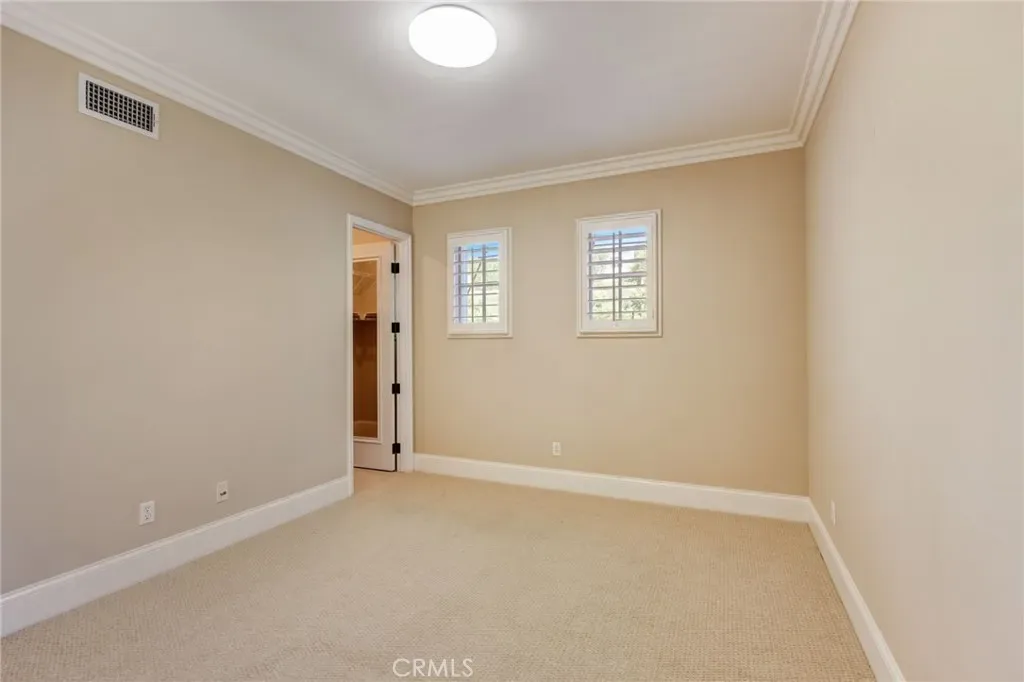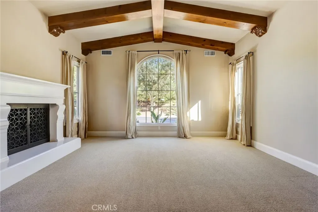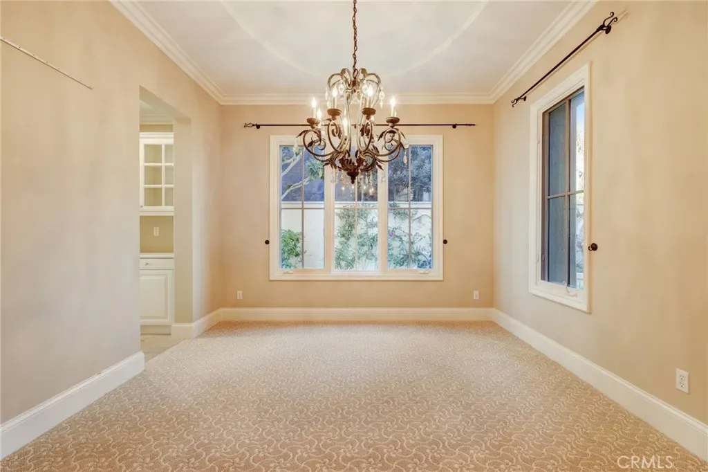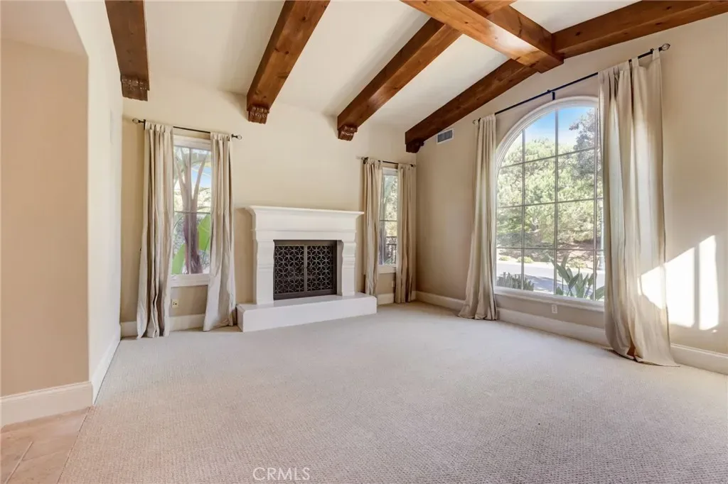 The living room features open beams, exuding a warm and inviting ambiance, complemented by crown molding that adds a touch of sophistication to the space. Organized closets and garage storage solutions ensure that everything finds its rightful place, enhancing the home’s practicality.