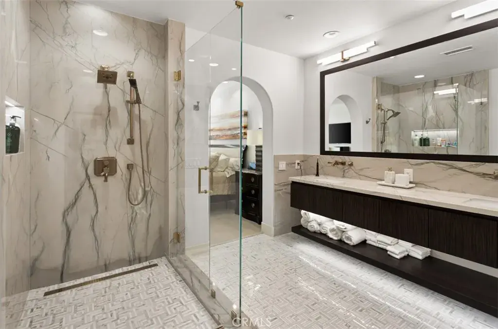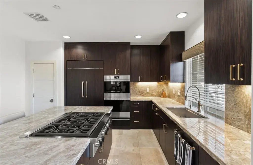 The open concept layout invites light to flow seamlessly through expansive windows, highlighting the home’s fresh neutral palette and refined craftsmanship. The gourmet kitchen features high-end appliances, custom cabinetry, and elegant stone countertops, ideal for both everyday living and entertaining. Retreat to the serene primary suite, a true sanctuary with a beautifully appointed bathroom adorned in designer Brazilian quartzite stone and premium fixtures.