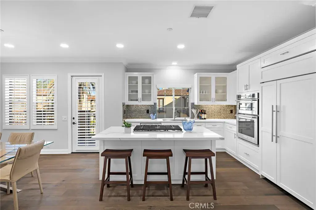 Welcome to a sanctuary of sophisticated coastal elegance nestled in the exclusive enclave of Ziani, Newport Coast. This exquisitely reimagined residence offers an unparalleled lifestyle of luxury and refinement, where every detail has been thoughtfully curated to elevate daily living into an art form. Step into an impeccably styled interior, where a crisp white palettes and rich wood accents create an atmosphere of serene sophistication. Boasting three spacious bedrooms and a refined den/office, this home seamlessly blends comfort with high design. Expansive living spaces are bathed in natural light, flowing effortlessly onto two generous balconies that capture gentle ocean breezes and tranquil vistas – ideal for relaxation or alfresco entertaining. Arched doorways and plantation shutters lend timeless architectural charm, while designer finishes add modern flair, crown molding, wide-plank flooring, and recessed LED lighting. A chef’s dream kitchen is airy and expertly appointed with a quartz island, counter seating, a built-in SubZero refrigerator, high-end stainless steel appliances, and a striking designer backsplash. The adjacent dining room and inviting living room with a glowing fireplace are perfect for sophisticated entertaining or intimate gatherings. Additional highlights include a second-level laundry room and a finished two-car garage with abundant storage offering added convenience. Residents of Ziani enjoy access to an array of resort-style amenities, including a private pool and spa, clubhouse and putting greens. Ideally located moments from world-class golf courses, upscale dining, premier shopping, and scenic hiking/biking trails with direct access to the Beach. A rare offering in one of Southern California’s most coveted coastal communities, this turnkey residence is the epitome of California elegance—where elevated design meets effortless lifestyle.