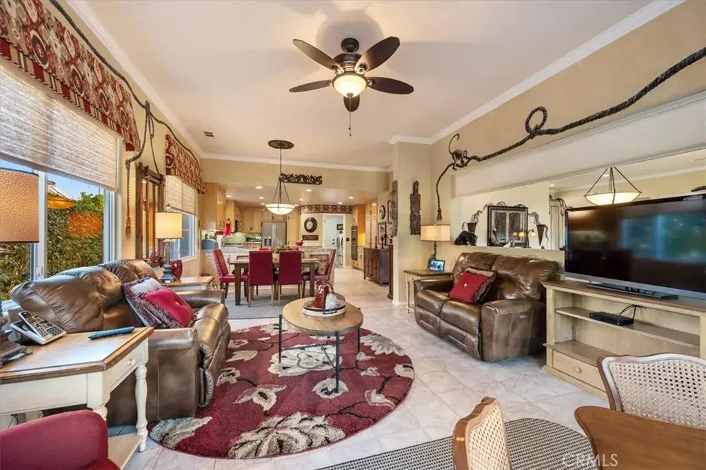 This 2,320 sq ft single-level floor plan includes a detached one-bedroom, one-bath casita, ideal for guests, a home office, or hobby space. The main residence features soaring windows that flood the home with natural light, a cozy living room fireplace, and an adjoining dining area perfect for entertaining.