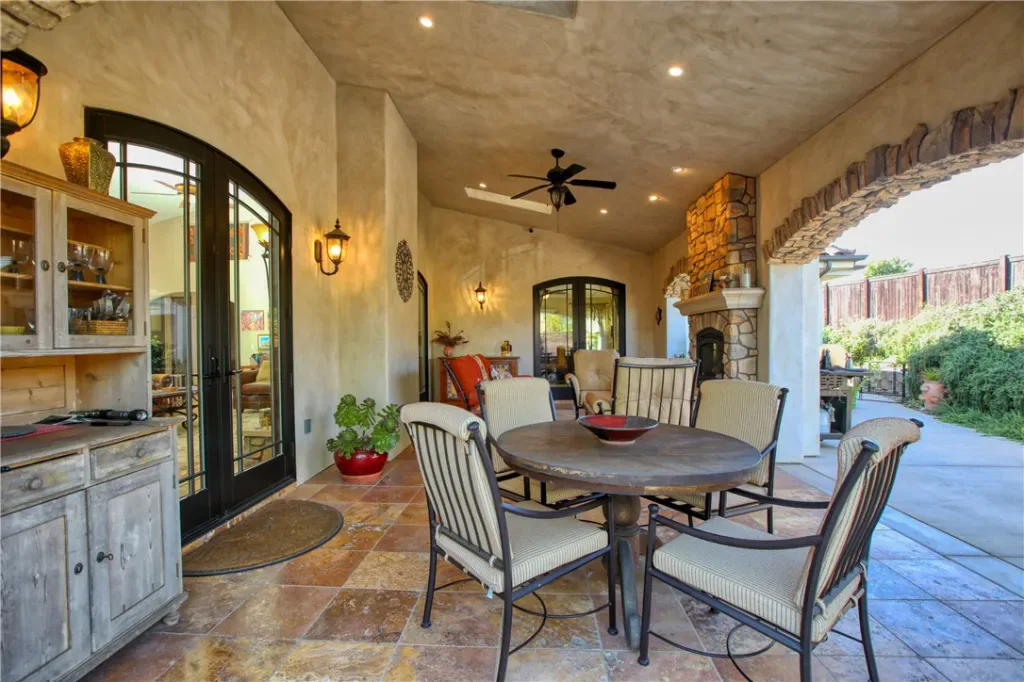 he heart of the home opens through custom 9-pane Andersen French doors to a spectacular 14’ x 28’ covered patio—an entertainer’s dream—complete with travertine floors, a gas-insert fireplace, and elegant arch-topped openings. A private, walled front courtyard offers an additional serene outdoor retreat.