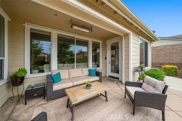 Outdoor living is a breeze with a covered patio featuring an overhead heater, perfect for year-round enjoyment. The private backyard retreat provides plenty of space for entertaining or relaxing.