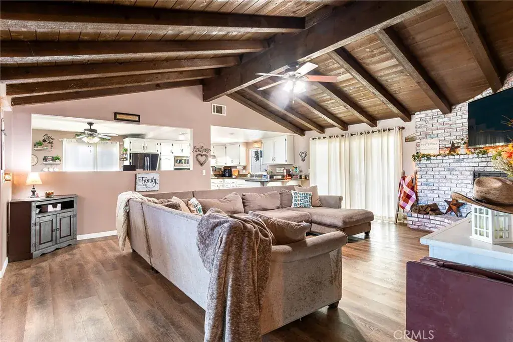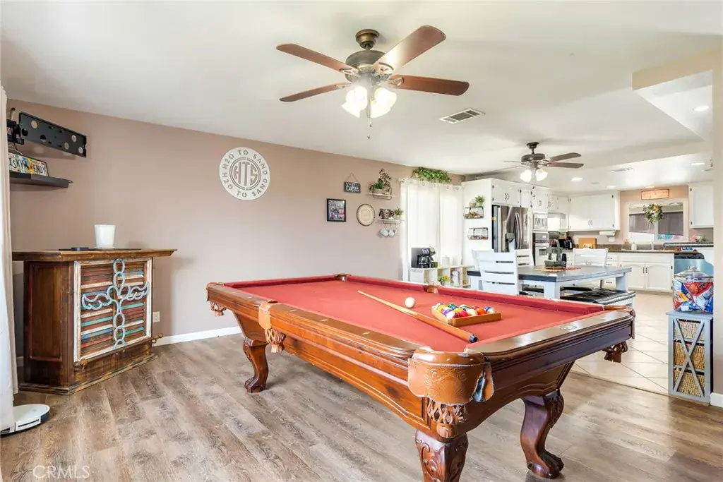 Expansive single-story equestrian-friendly property offering the quintessential Norco lifestyle on a 20,037 sq. ft. lot. This well-maintained home features 4 bedrooms, 1.75 bathrooms, and 2,395 sq. ft. of open-concept living space, with a large living room, kitchen, and dining area flowing seamlessly together—ideal for both everyday living and entertaining. The spacious living room is highlighted by beautiful exposed wood beams and a brick wood-burning fireplace with gas starter, creating a warm and inviting focal point. The formal dining area is currently configured as an entertainment space with a pool table and bar, showcasing the flexibility of the floor plan and easily convertible back to a traditional dining area. The dine-in kitchen is both functional and inviting, featuring painted cabinetry, Whirlpool stainless steel appliances, a 5-burner gas cooktop, brand-new dishwasher, and pantry with pull-out shelving. Flooring throughout includes laminate flooring, with tile in the bathrooms. The primary suite is generously sized and comfortably accommodates larger furniture, offering a private retreat with an updated walk-in shower, separate soaking tub, dual-sink vanity, and three spacious closets. The three guest bedrooms include laminate flooring and ceiling fans, and additional hallway storage adds everyday convenience. A separate indoor laundry room is conveniently located just off the garage and provides excellent built-in storage. Recent exterior improvements include fresh exterior paint and newer vinyl windows, enhancing curb appeal and energy efficiency. Outdoor spaces are designed for enjoyment and function, featuring a sparkling swimming pool approximately 9 feet deep, a generously sized spa, and a grassy front yard. Along the side of the home is a fenced dog run currently used as a chicken coop, approximately 8 ft x 20 ft. Equestrian amenities include four horse stalls and two sheds—one for tack and one for storage/feed. Additional highlights include a 3-car attached garage with excellent storage, garage workbench included, 34-ft RV parking, and paid-off solar with 27 panels, providing long-term energy savings. Ideally located near SilverLakes Equestrian & Sports Park, offering convenient access to equestrian facilities, sports fields, and community events. A rare opportunity to own a versatile property that blends generous living space, character details, thoughtful upgrades, outdoor amenities, and Norco’s signature equestrian lifestyle.