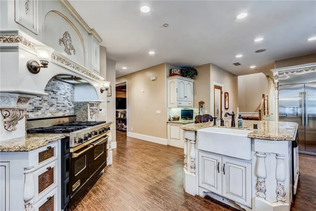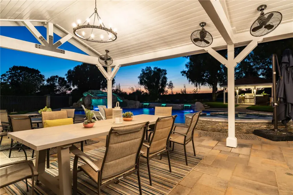 The 5,500 square foot main residence offers five bedrooms, six baths, dual staircases, a chef’s kitchen, game room, and library. Outdoor living includes a resort style pool with waterfall and spa, outdoor kitchen, koi pond, and expansive patio.