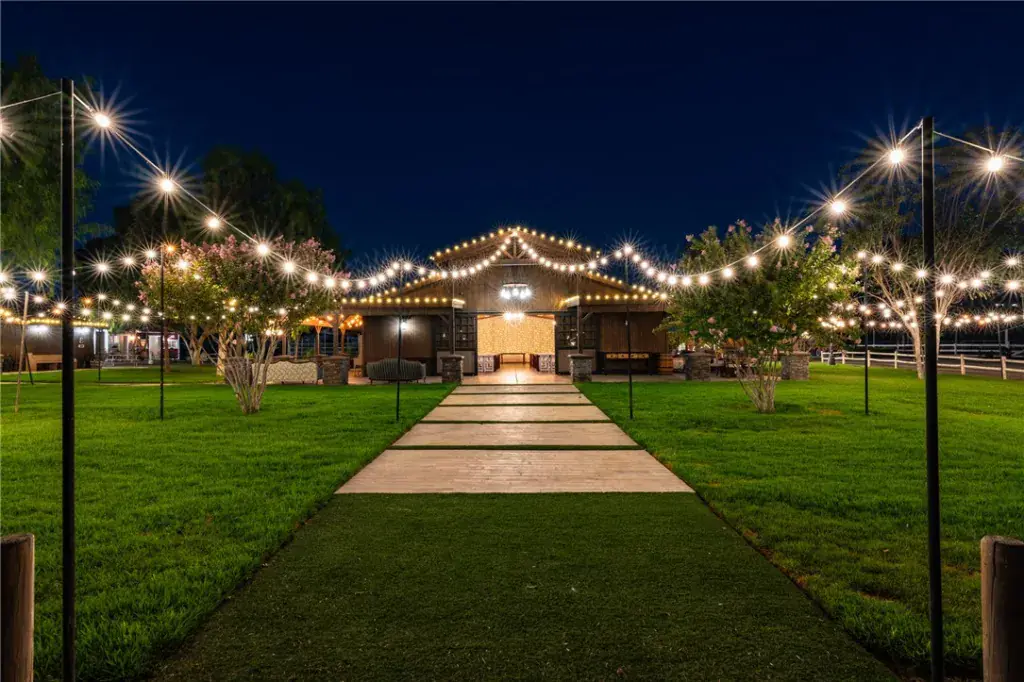 Event facilities feature a 3,000 square foot ADA compliant barn with seating for 200, fire sprinklers, chandeliers, catering kitchen, restrooms, décor storage, and a charming bride’s cottage. Manicured lawns, arches, string lighting, and a horse drawn carriage complete the wedding setting.