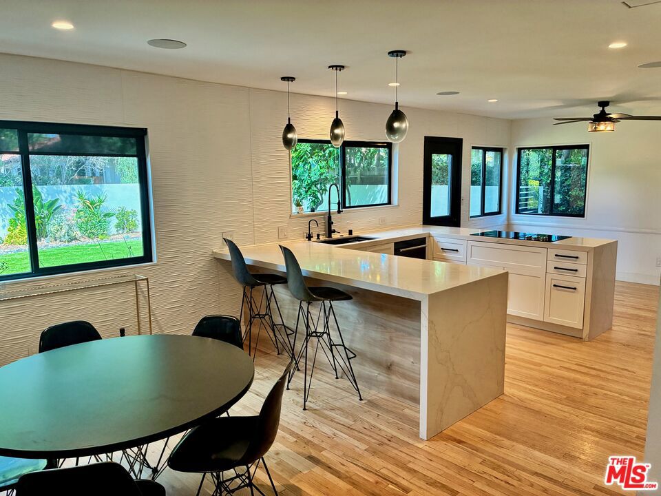 Beautifully remodeled and thoughtfully designed, this modern retreat blends style, comfort, and convenience. The home features a stunning new kitchen, a sunken living room that creates a warm and inviting gathering space, and stylish mid-century modern furnishings that add character and sophistication throughout. A whole-home Sonos in-ceiling surround sound system allows music to flow seamlessly through every room, with the ability to play up to four different songs at once. Step outside to a spacious backyard complete with lush drought-tolerant landscaping and elegant uplighting that creates a beautiful evening ambiance. Located on a quiet cul-de-sac with minimal traffic and plenty of street parking, the neighborhood offers a calm, community-oriented atmosphere where kids can safely ride bikes. Energy-efficient solar panels help keep electricity costs low during the warmer months, while the home’s central location provides quick access to multiple major freewaysmaking it easy to navigate around traffic and get anywhere in Los Angeles with ease. The garage has been upgraded with an EV car charger and a brand new Smith gym. Pet lovers will also appreciate the thoughtful touches, including a large dog door that leads to the backyard, where durable, high-quality artificial turf keeps the space looking pristine year-round. A rare lease opportunity combining modern updates, outdoor space, and everyday convenience.