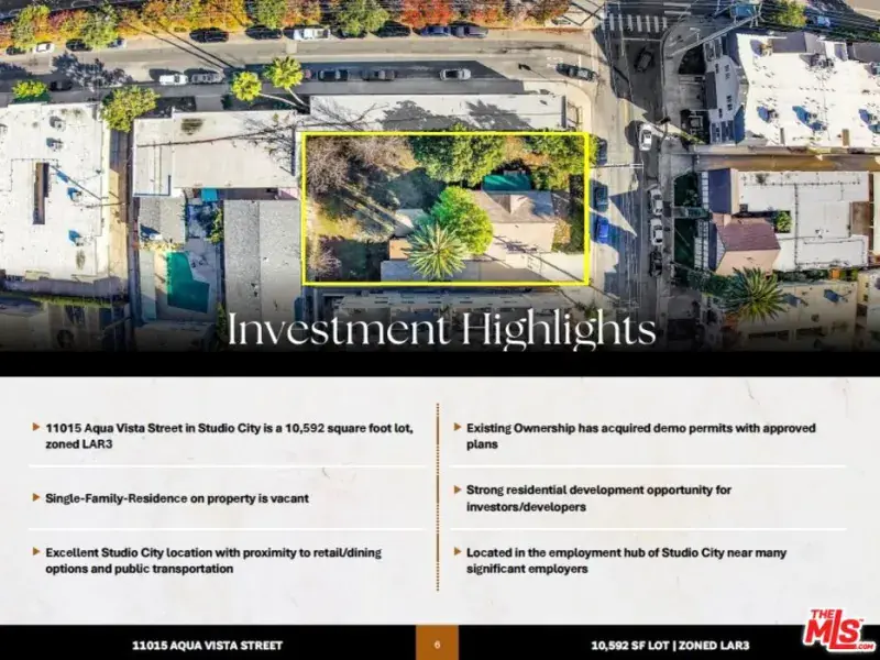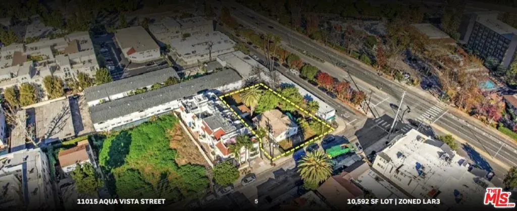 11015 Aqua Vista Street in Studio City is a 10,592-square-foot lot, zoned LAR3, that currently hosts a vacant 1,274-square-foot home built in 1908. Current ownership has obtained permits and has approved plans to demolish the structure. The offering presents the opportunity for experienced developers and investors to acquire a significant asset in one of LA’s most desirable locations and develop it into a strong investment property. At the corner of Aqua Vista Street and Vineland Avenue, the location is ideal for would-be tenants due to its proximity to dining and entertainment attractions, multiple major employers, and major transportation hubs. Specifically, the site is located minutes from the 101, 134, and 170 freeways, as well as the nearby Metro B Line (Red) at the Universal / Studio City Station stop.