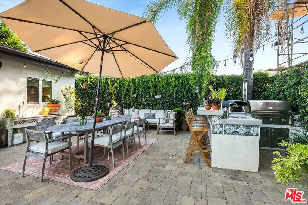 Designer-Curated Spanish Sanctuary!! Step into this beautifully remodeled Spanish-style sanctuary in coveted West Toluca Lake and immediately feel the harmony of old-world elegance and modern luxury. Behind a private floral wall, two wooden doors open to a tranquil front courtyard, setting the tone for this meticulously updated 3-bedroom, 2-bathroom home. Inside, an open floor plan unfolds beneath soaring vaulted ceilings, complemented by exposed beams and arched windows that bathe the space in natural light. Designer wall coverings, Moroccan chandeliers, and a striking black-and-white palette unify the interiors, while custom built-ins add both functionality and flair. The formal living room features a charming bay window, creating a cozy nook, and a built-in desk adjacent to a statement-making tile-surround fireplace. A floor-to-ceiling glass wine cabinet elegantly separates the living and family rooms, enhancing the home’s sophisticated flow. The gourmet kitchen is a chef’s dream, fully renovated with thick quartz countertops, a breakfast bar, and top-tier stainless steel appliances including Thermador 6 burner with griddle and 2 ovens. A Control4 surround sound system integrates seamlessly throughout the home for effortless ambiance and entertainment. French doors and sliders open to two oversized stone patios, seamlessly extending the living space outdoors. The private backyard is a serene escape, complete calming fountains (5 total on the property), mature greenery, citrus trees in Mediterranean pots, and a lush lawn. A built-in BBQ with bar and a covered lounge area create the perfect setting for alfresco dining and entertaining.The primary suite offers three spacious closets including a in and a luxurious ensuite bath. Two additional bedrooms and a beautifully updated bath continue the home’s story of refined design and comfort. Additional highlights include a whole-home water softening system and alkaline water dispenser, an oversized two-car garage, professionally designed landscaping, 5 year old roof and copper plumbing. Set back from the street and enveloped by verdant surroundings, this home offers both privacy and curb appeal blending timeless Spanish architecture with elevated modern living in one of West Toluca Lake’s most sought-after locations.