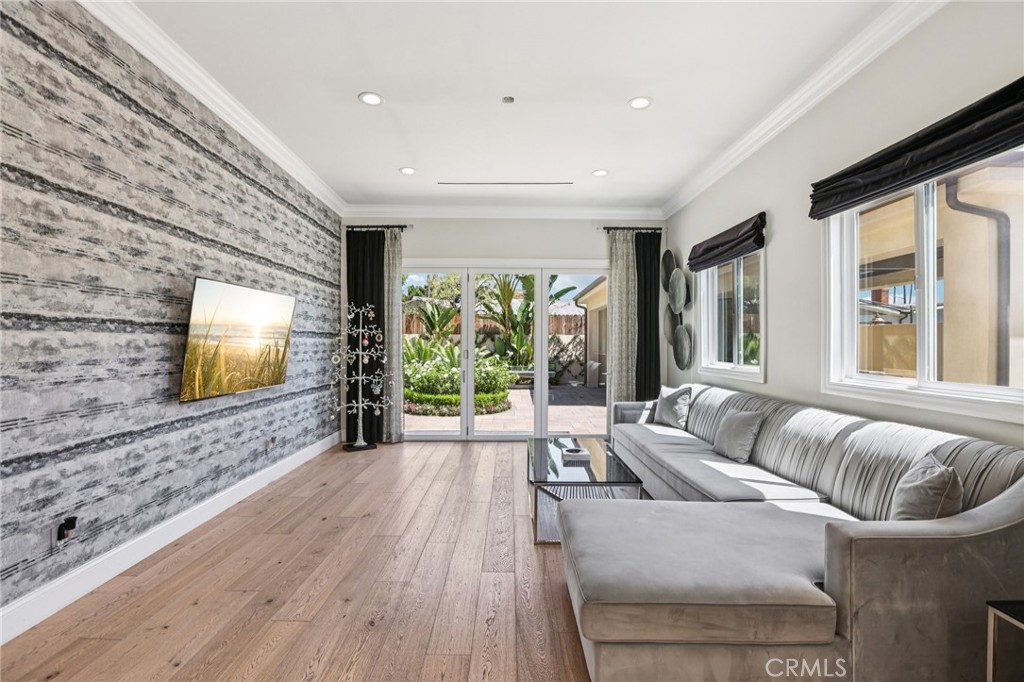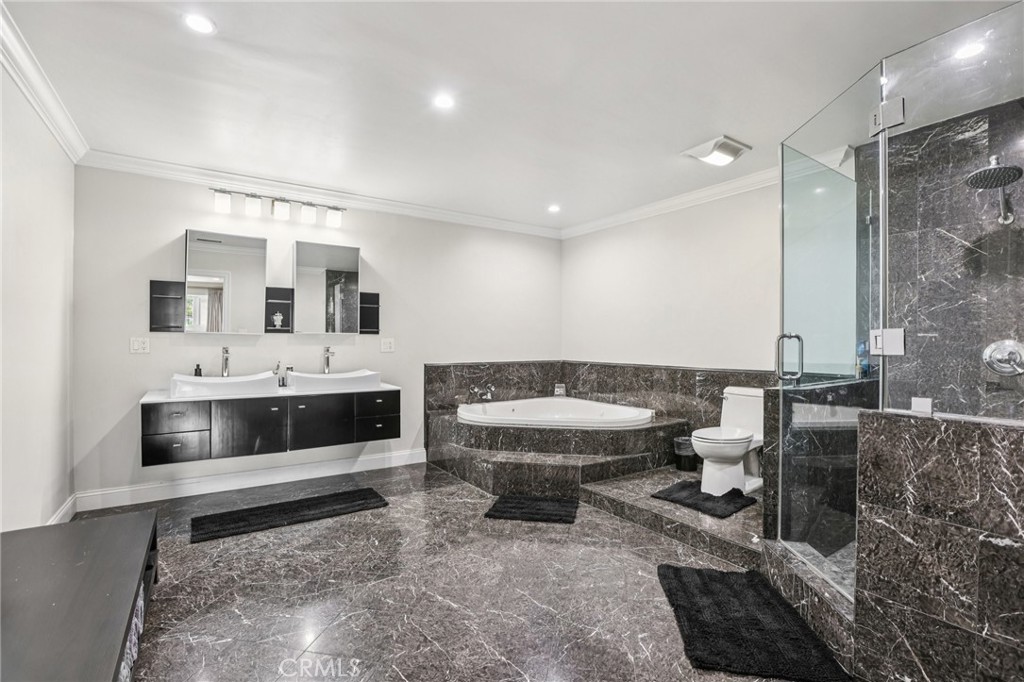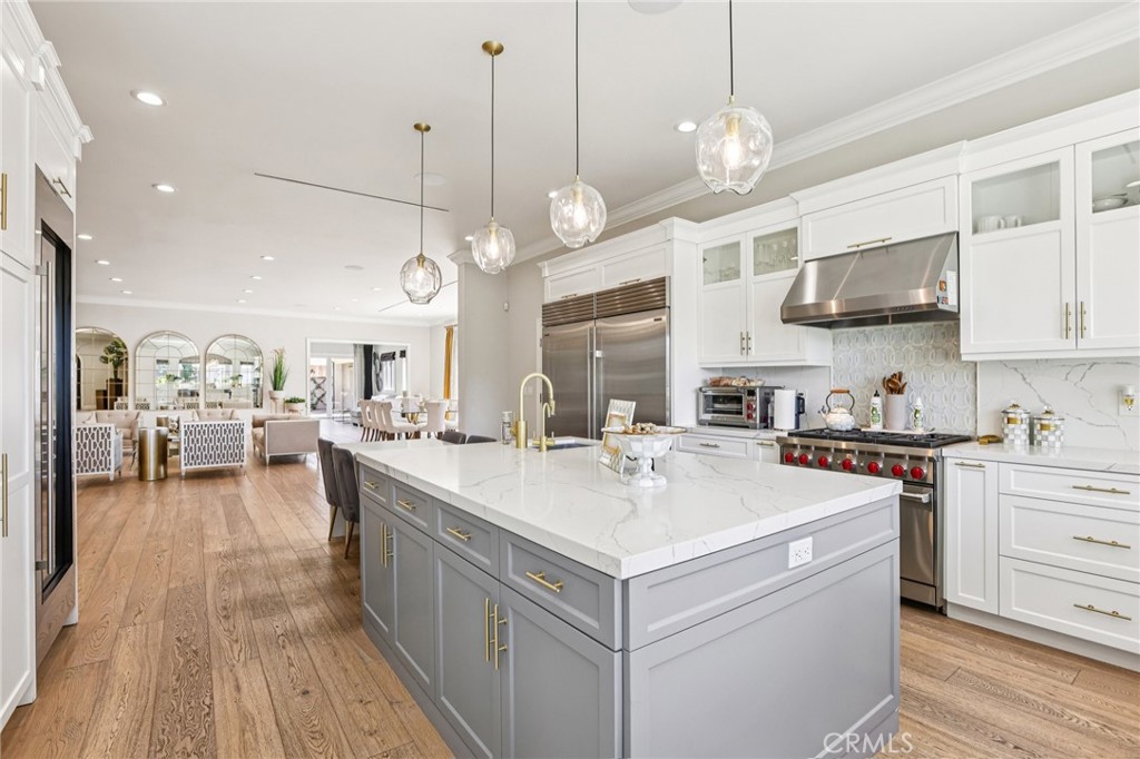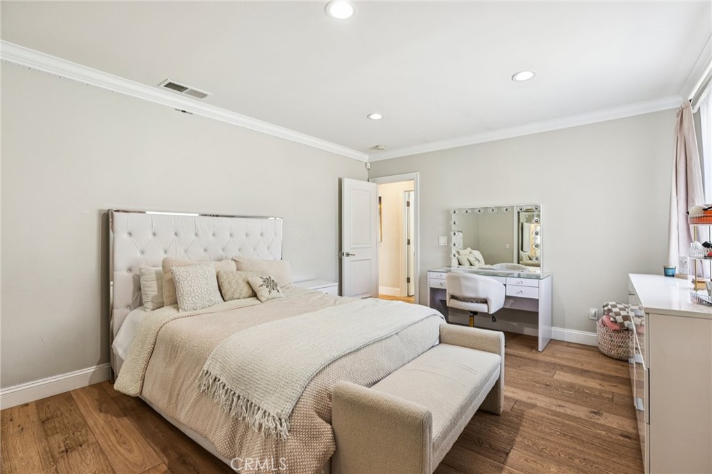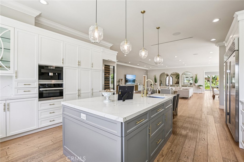 Welcome to 6850 Longridge Ave, a tastefully reimagined Mediterranean style villa featuring 3,450 sqft of living space designed with a light-filled, open floor plan ideal for large gatherings situated on an expansive 11,600 sqft lot! Upon entry you are greeted with an abundance of natural light, high ceilings, recessed lighting, and rich hardwood flooring seamlessly connecting the living room, kitchen, and family rooms. The chef s kitchen boasts an extended center island w/ additional seating, high-end stainless appliances, wine cooler, and plenty of cabinetry. The spacious primary bedroom features a spa-like en-suite bath and roomy walk-in closet with custom built-ins. A secondary bedroom also features an en-suite bath and the third bedroom is paired with a private bonus room. Both the interior & exterior of the home are wired with a high-end audio system catering to audiophiles for the ultimate listening experience. For those who love spending time outdoors, a resort-style backyard paradise awaits. Surrounded by palm trees, the covered patio & BBQ area overlooking the glistening pool, spa & firepit makes this an ideal, private setting for gatherings day or night. Additional highlights include a spacious garage w/ ample storage space to accommodate any buyers needs while the circular driveway can support parking for large families. Don’t miss this one-of-a-kind home blending sophistication, comfort, and unforgettable entertaining spaces.