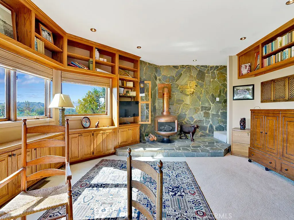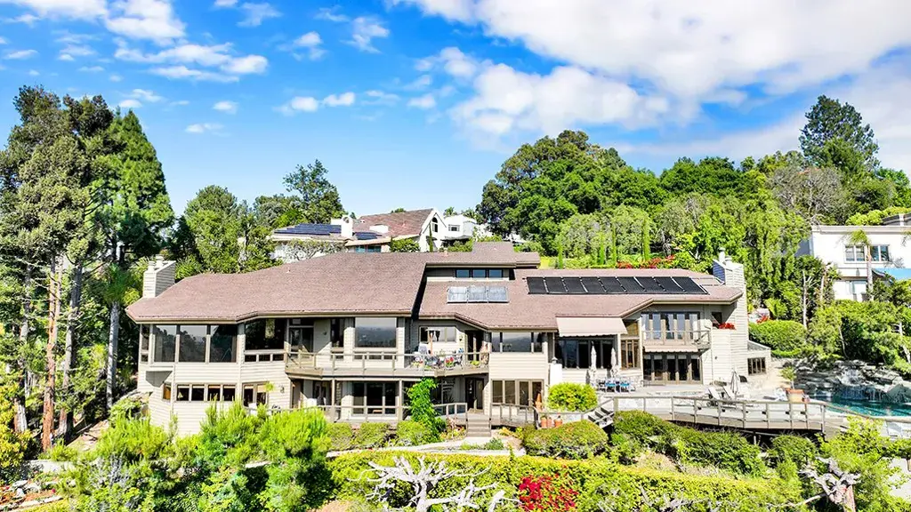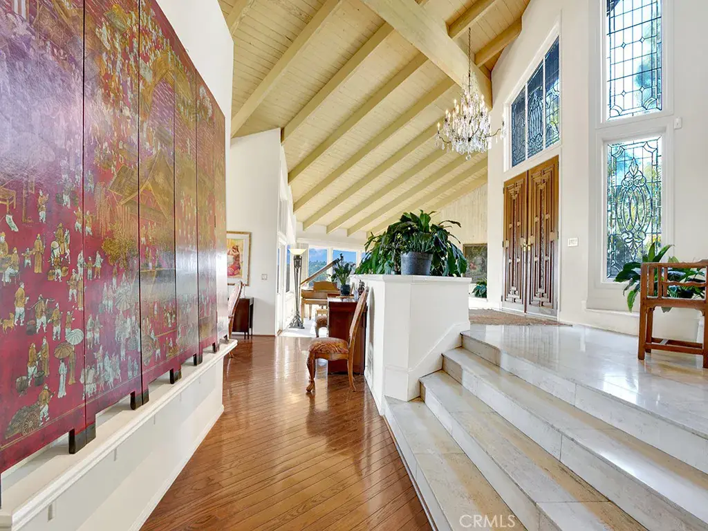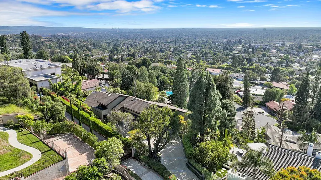 Dramatic 180 degree views of Tustin, Irvine, Fullerton and sunset over the Pacific from this custom gated estate home nestled in the hills of North Tustin. Boasting a large 7,622 sf open space floor plan for family living and entertaining, the home was designed by award winning architect Ron Yeo. Conceived for a family lifestyle with an emphasis on entertainment – from its soaring ceilings to its large sit down bar & media center, private Wine Tasting Room with chilled cellar, Family Entertainment Center w pool table, fitness space w barre, bar, and hot rock sauna, all with access to outdoor decks and a resort style natural rock waterfall solar-heated pool, spa and built-in BBQ – the home follows family, fun and function. An elegant entrance welcomes with mini-garden, large crystal chandelier and THE VIEWS opening the home to the living room with fireplace and dining room with crystal chandelier. The adjacent kitchen with breakfast nook and outdoor patio is intimate and accessible. Stepping down to the seated bar & media area, the home opens up further to the family room with copper fireplace including a reading nook and access to the large pool deck. Continuing along the view deck multiple doors open to the Family Entertainment Center and an adjacent convertible office/library incorporating another copper fireplace, built-in bookcase conveniently located just below the living room and entry foyer with direct stairway access. Upstairs bedrooms feature a large master with fireplace, outdoor deck and master closet with built-in island cabinet. The master bath impresses with a 2 head shower, spa tub, double sinks, garden feature, skylight and 2 chandeliers. Additional living space includes 2 en suite bedrooms with private patios, and a 4th bedroom with adjacent bath. Other unique features of this blended living space include a Zen garden retreat with water feature, 3 car garage with extensive built-in storage cabinets and workbench, integrated alarm and intercom system, central vacuum, 2 tankless water heaters, 4 furnaces, 4 a/c units, 2 skylights and hardwood floors to name just a few of the many luxury features of this estate. The home’s exterior was painted in 2023 with new decks installed in the last 3 years. A key safety feature provides crucial wildfire protection with an integrated roof sprinkler system and strategically located controls in the master bedroom and garage.