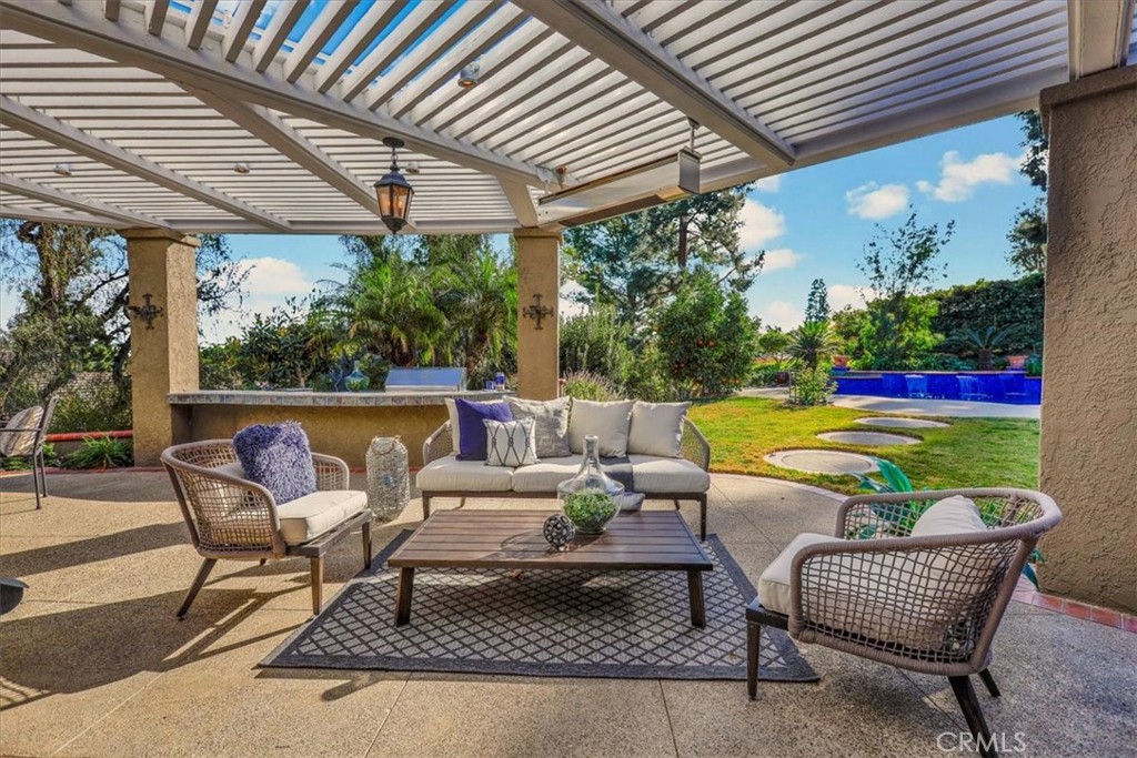 offers multiple vignettes for alfresco dining and relaxation. The outdoor kitchen includes