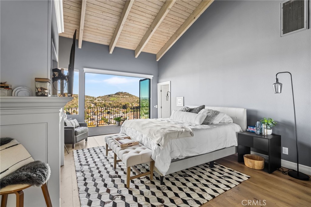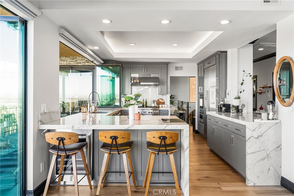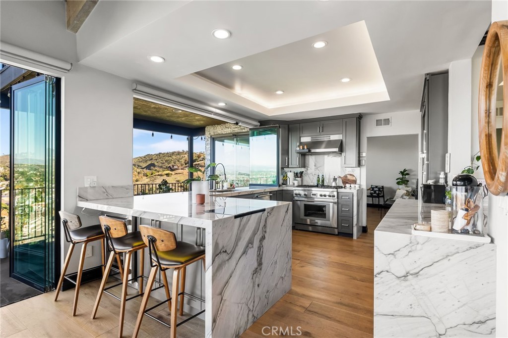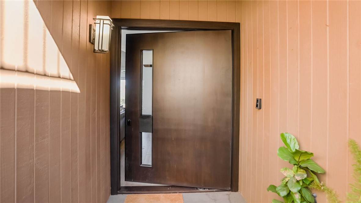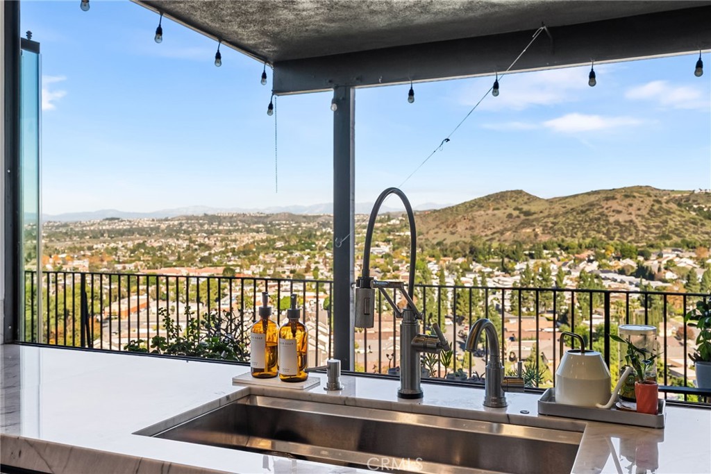 Perched in the hills of North Tustin, this beautifully reimagined home pairs a modern, high-end aesthetic with the charm of a quiet, established neighborhood known for its peaceful hillside setting. 12348 Circula Panorama showcases sweeping views of city lights and surrounding mountains, framed by dramatic architecture, soaring ceilings, and expansive glass that fills every room with natural light. A striking pivoting front door sets the tone, opening to an airy interior defined by clean lines, contemporary finishes, and floor-to-ceiling windows that seamlessly blend indoor and outdoor living. Thoughtfully placed Marvin sliders and generous balconies invite you to enjoy panoramic vistas from nearly every angle, creating an ambiance reminiscent of a private retreat. The main level centers around a fully redesigned chef’s kitchen featuring premium stainless-steel Thermador appliances—including a wine refrigerator and microwave drawer—sleek custom cabinetry, a built-in espresso station ideal for morning rituals or entertaining, and extensive quartz waterfall countertops. The kitchen opens to an informal dining area and a warm, inviting great room anchored by a fireplace, with a formal dining room, currently used as a creative space, located just off the kitchen. White-oak engineered wood flooring enhances the home throughout. Spanning approximately 3,200 square feet on nearly half an acre, the property embraces indoor-outdoor living with multiple terraces and a gently sloping lot offering potential for a custom deck, garden terrace, or additional outdoor entertainment areas. Designed with comfort and flexibility in mind, the floor plan includes a convenient main-floor bedroom and a remodeled main-floor bathroom. The lower level features three additional bedrooms and a remodeled bathroom—ideal for guests, multigenerational living, office use, or creative workspaces—while the privately situated primary suite occupies the top floor, maximizing both privacy and elevated views. With each level opening directly to its own balcony, the home offers effortless opportunities for al fresco dining, relaxation, and entertaining against a stunning natural backdrop, blending modern luxury with timeless tranquility in the heart of North Tustin.