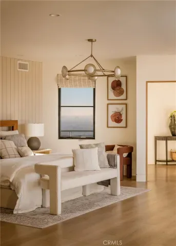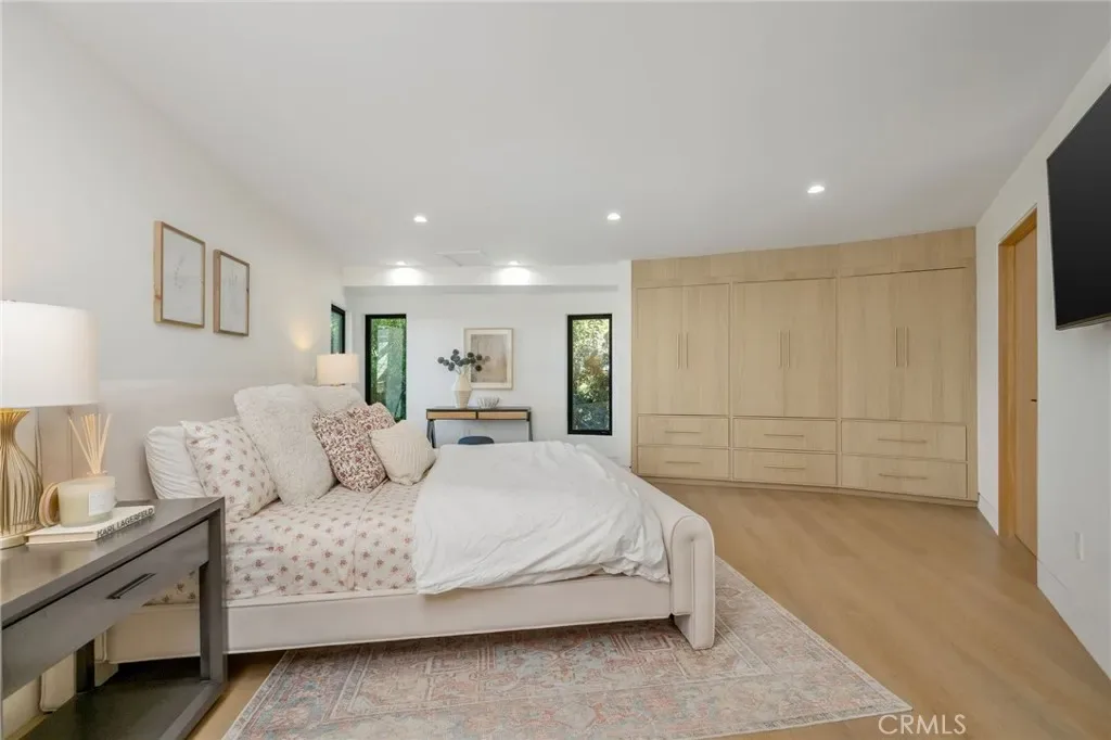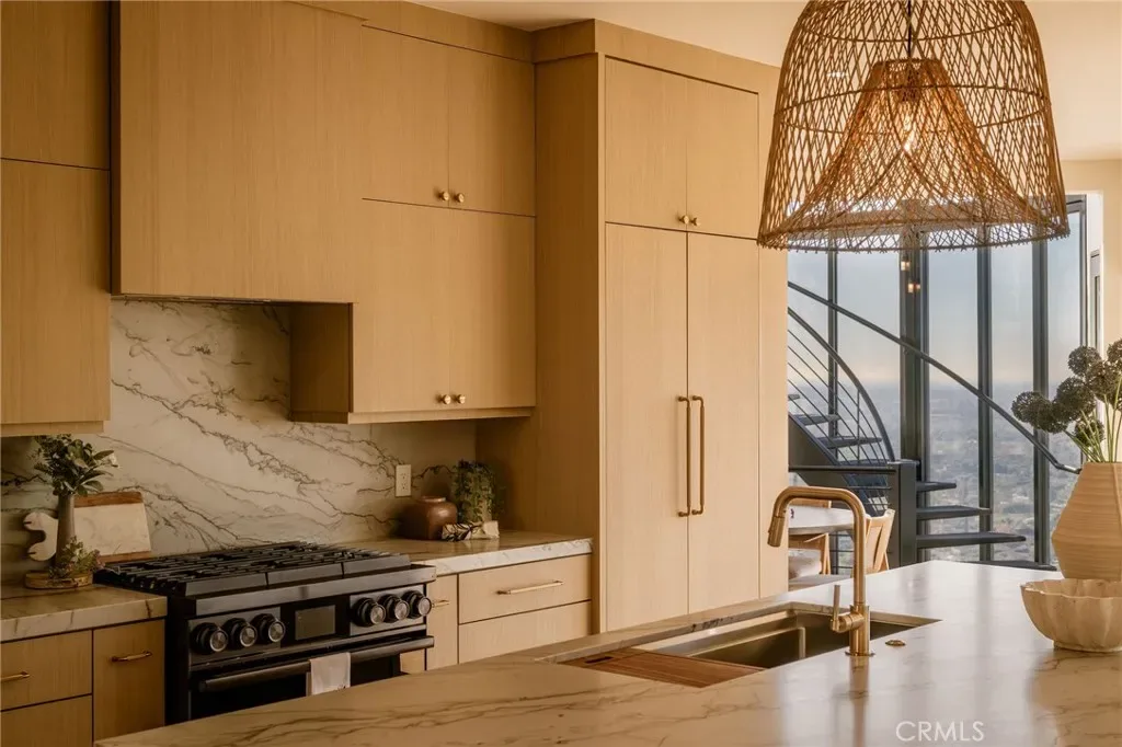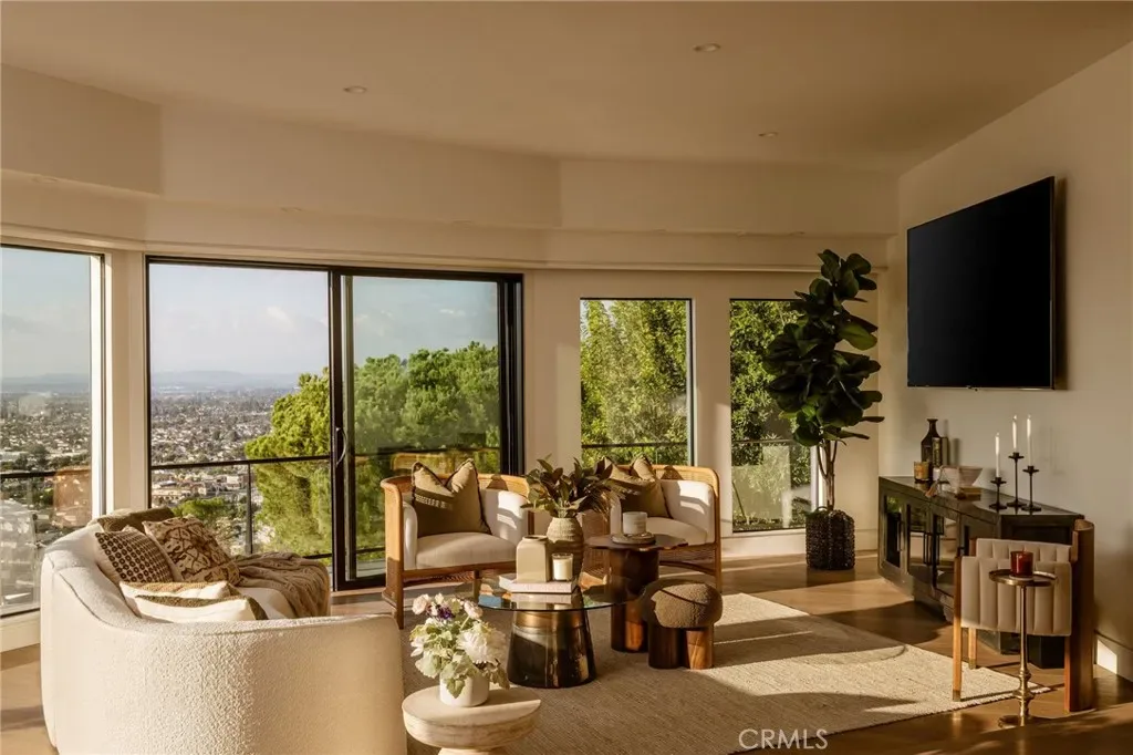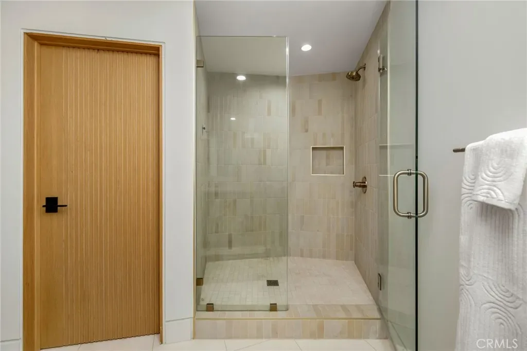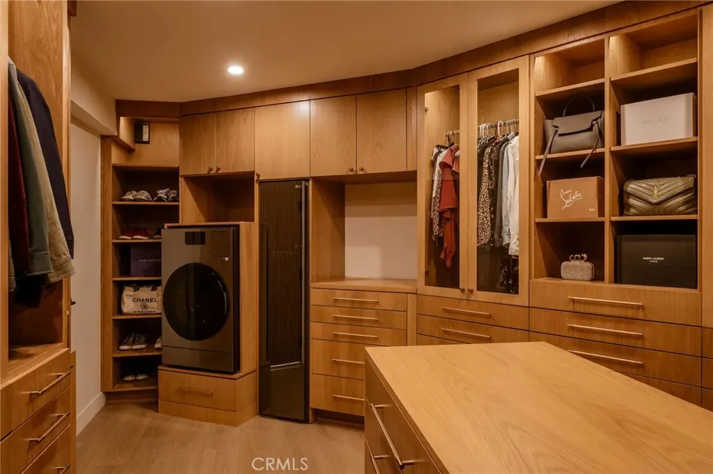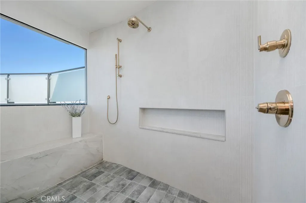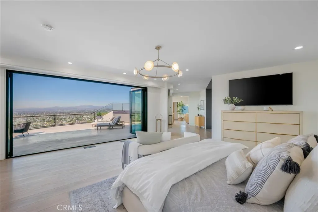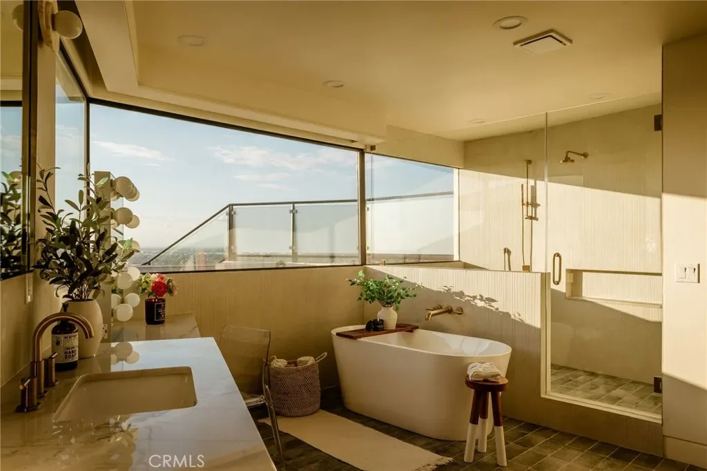 The primary suite occupies its own private level, delivering a true resort experience. Step onto a 1,200-sq-ft view deck with spa-style hot tub, travertine firepit, and lounge areas overlooking ocean, city, and sunset views. Inside, the suite includes floor-to-ceiling sliding glass doors, a dedicated office, and a spa-inspired bath with dual vanities, heated floors, and a freestanding soaking tub. The custom walk-in closet features its own washer/dryer combo and LG clothing steamer. A coffee bar and beverage fridge complete this exceptional retreat.