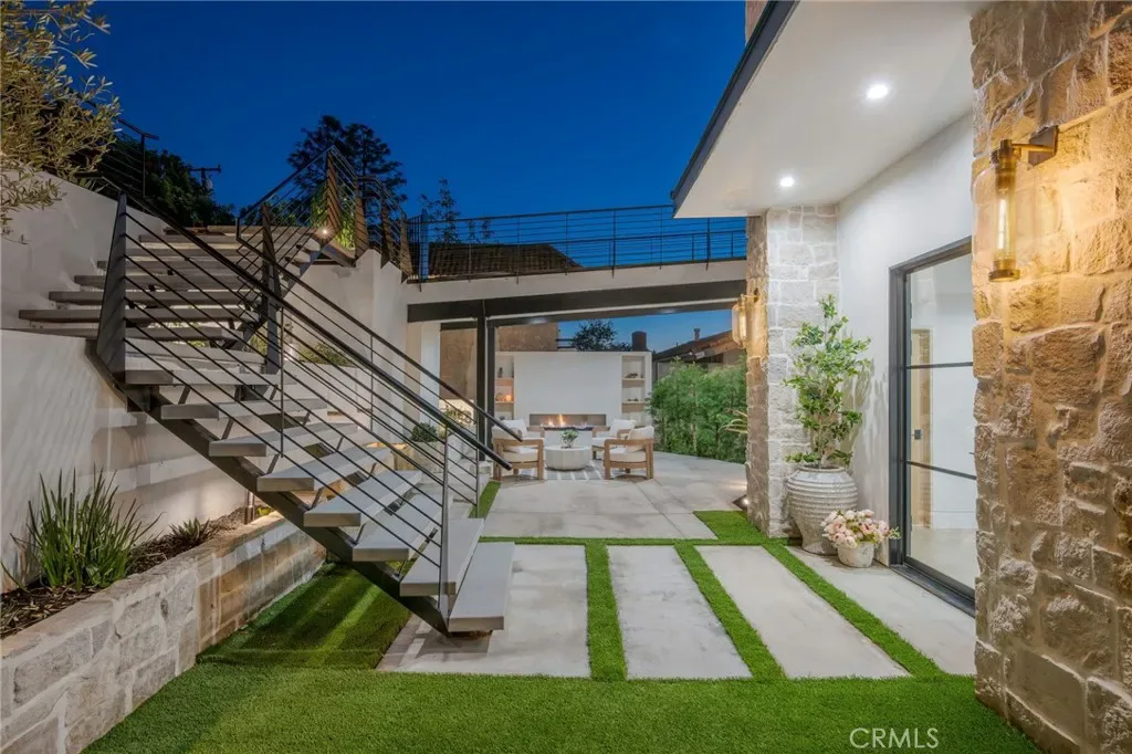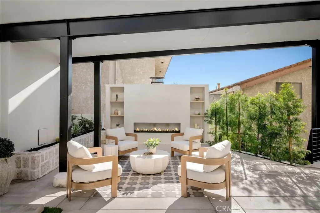 Multiple outdoor spaces provide endless options for relaxation and entertaining, including a private courtyard with fireplace, fountains, mature olive trees, and landscape lighting. Backyard renderings are available, offering future potential for a pool and expanded outdoor living.