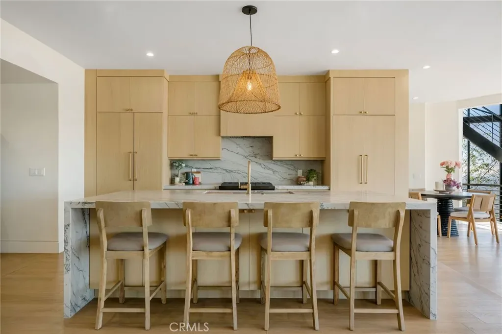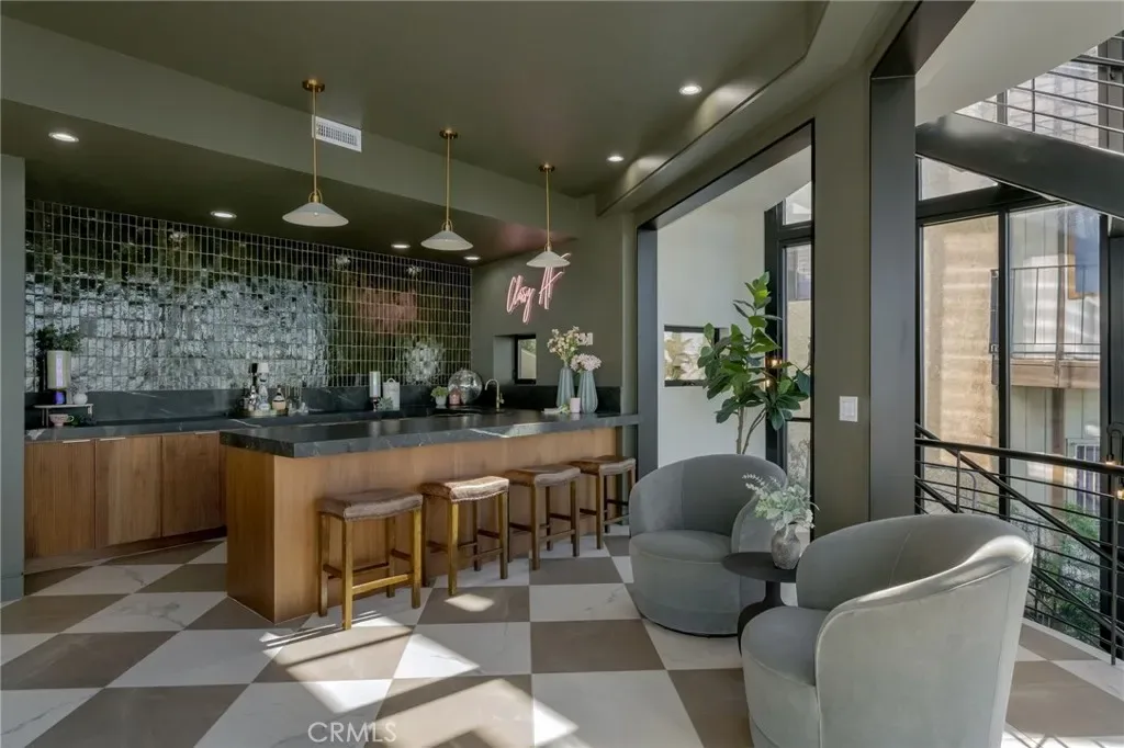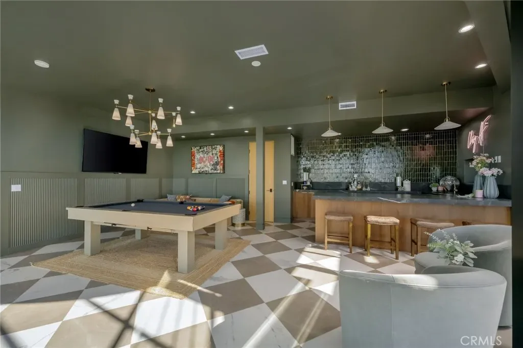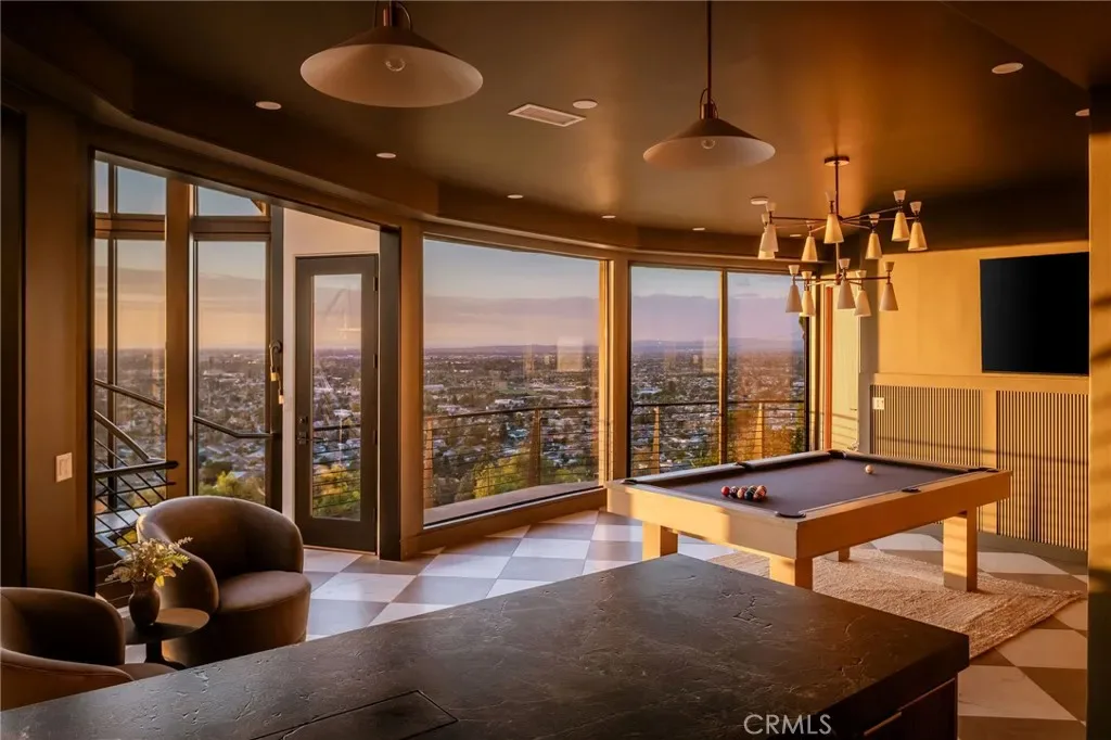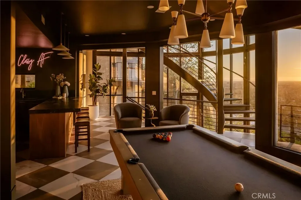 The lower level is an entertainer’s dream, anchored by a full custom bar with fluted walnut cabinetry, dramatic black quartzite countertops, ice maker, dishwasher, fridge, and restaurant-style sink trough with glass rinser. A pool table area, bold design details, and floor-to-ceiling windows with panoramic views create a space made for unforgettable gatherings. An additional bedroom and bathroom plus direct backyard access offer flexibility for guests or extended living.