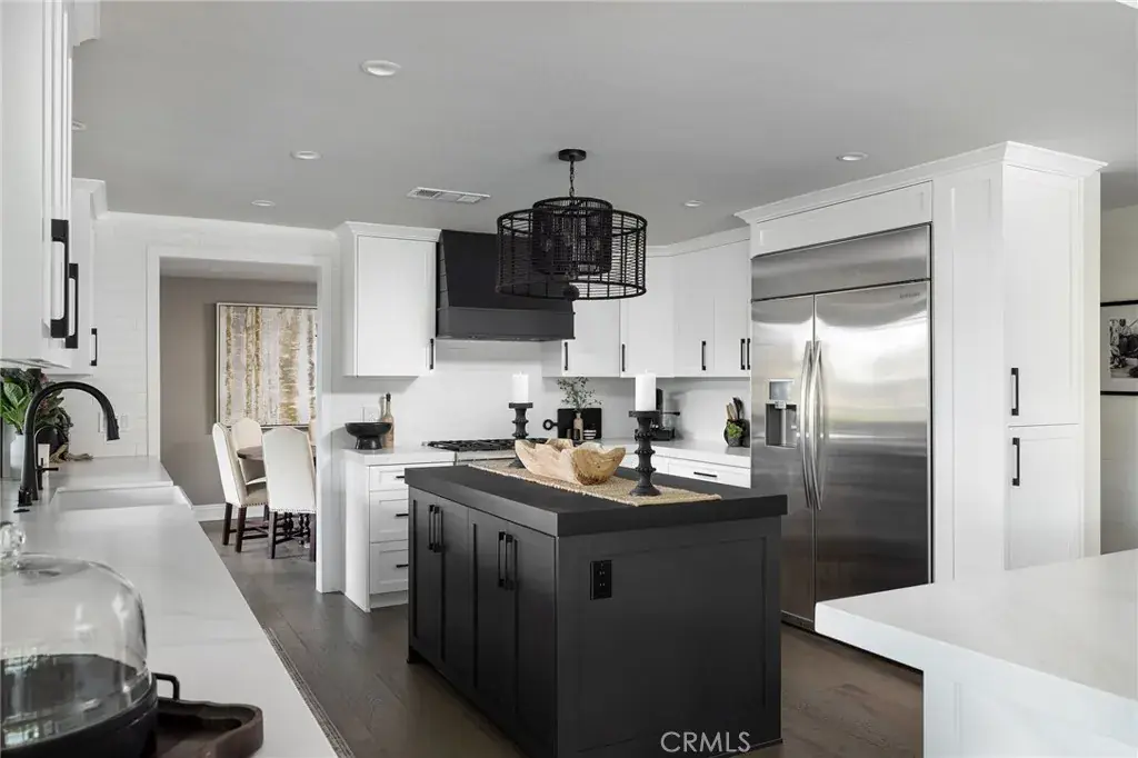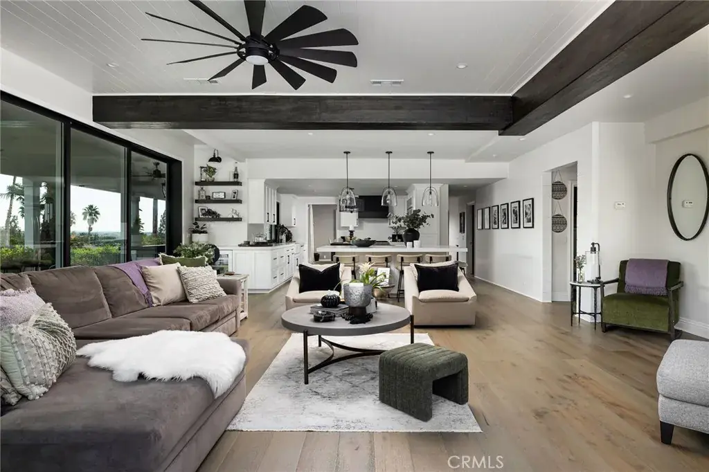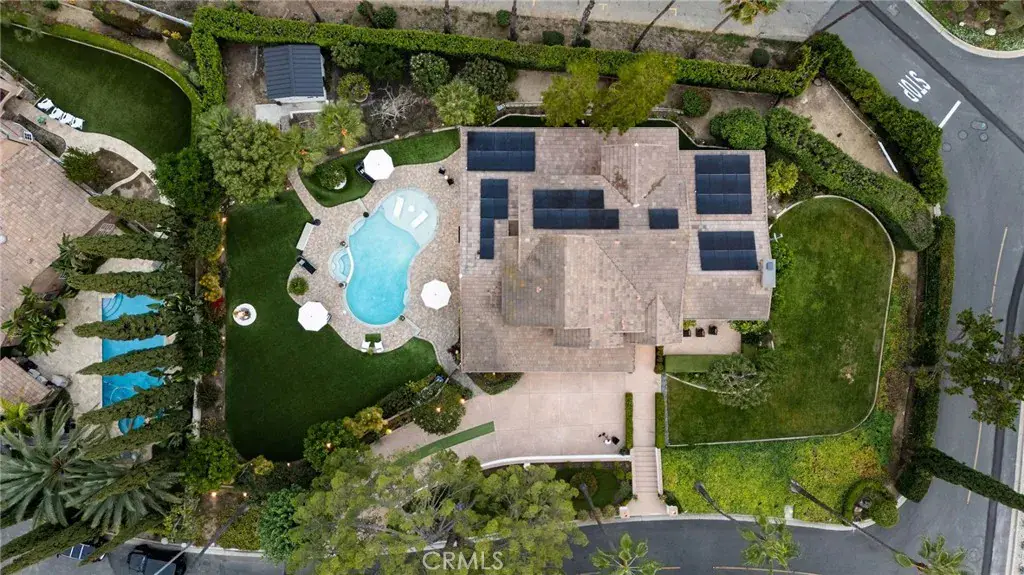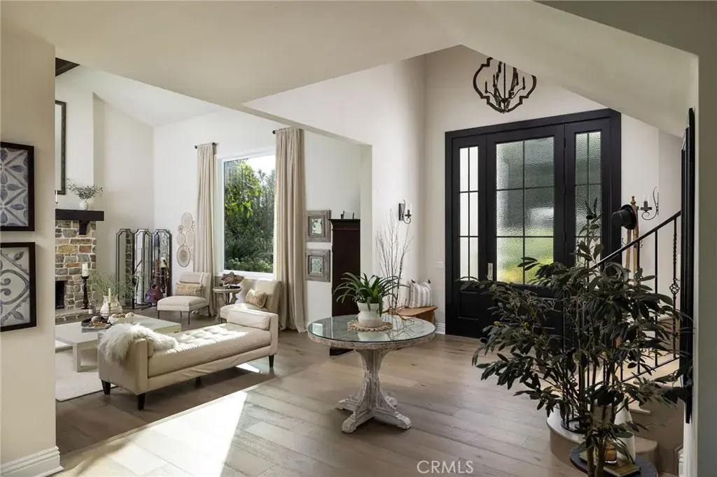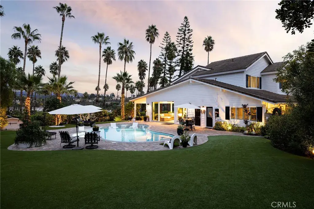 Perched on the corner of Valhalla and embraced by tranquil neighborhood and mountain views—with the Tustin Hills Racquet Club just a short walk away—this custom estate artfully combines modern luxury with effortless indoor–outdoor living across an expansive 26,000 sq. ft. lot, enhanced by mature landscaping and multiple producing fruit trees. Thoughtfully upgraded throughout, the 4,500 sq. ft. residence offers 5 bedrooms, 6 bathrooms, and a dramatic entry that introduces formal living and dining areas enhanced by soaring ceilings, a 10-ft custom front door, and a striking 6-ft stone fireplace. The main level also features a private in-law suite complete with its own bath and kitchenette, ideal for guests or multigenerational living.