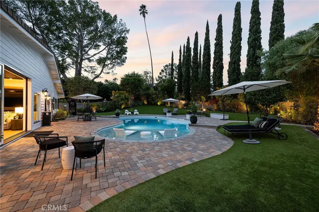 Designed for year-round enjoyment, the outdoor grounds feature a newly built pool and spa with lounge shelf, expansive artificial turf, multiple dining and relaxation areas, a gas firepit, and a covered California room appointed with heaters, ceiling fans, an outdoor kitchen, and a wet bar—set within a private, garden-like setting accented by mature fruit trees. Additional enhancements include an epoxy-finished 3-car garage, matching designer shed, upgraded lighting and irrigation systems, fully concealed pool equipment with dedicated storage, and a 49-panel Tesla solar array with battery backup.
