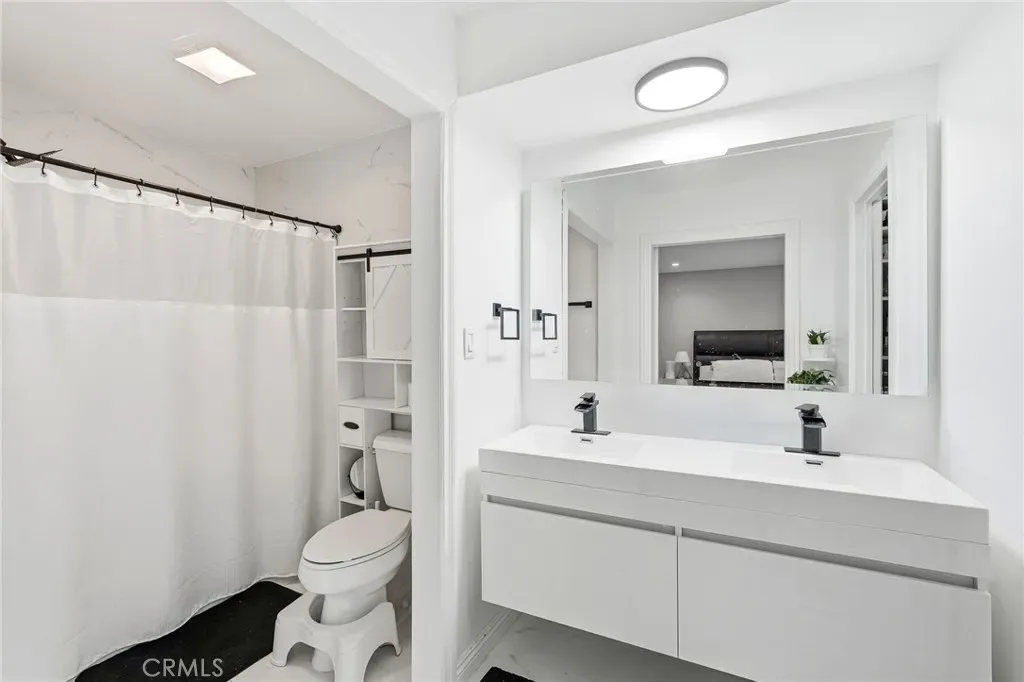 Upstairs, enjoy two spacious primary suites, each with generous walk-in closets. The primary suite showcases a fully renovated bathroom with a floating his-and-hers sink, a filtered soft water shower with tub, and marble tile. The second suite offers its own private bathroom with a walk-in shower and ample closet space. A guest half bath is conveniently located on the main level. In-unit laundry, a direct-access two-car garage, and a private patio with TV’s hookups perfect for entertaining, morning coffee, outdoor dining, or relaxing evenings.