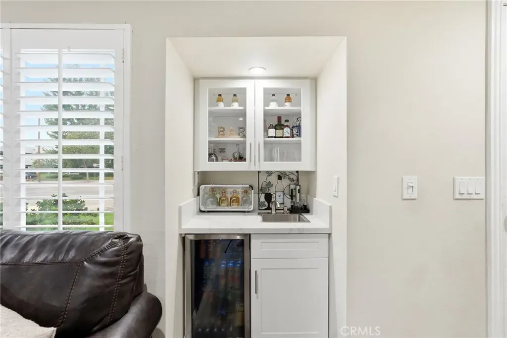 The light-filled living room features wide windows with custom wood shutters, recessed lighting, upgraded gray laminate flooring, wet bar, and a fireplace, flowing seamlessly into the dining area perfect for entertaining. The spacious kitchen boasts quartz countertops, a modern backsplash, glass-front cabinetry, and stainless steel appliances, ideal for cooking and gatherings.