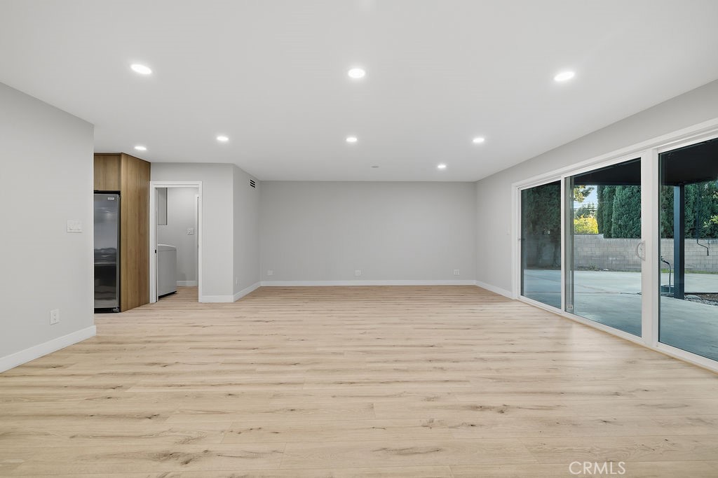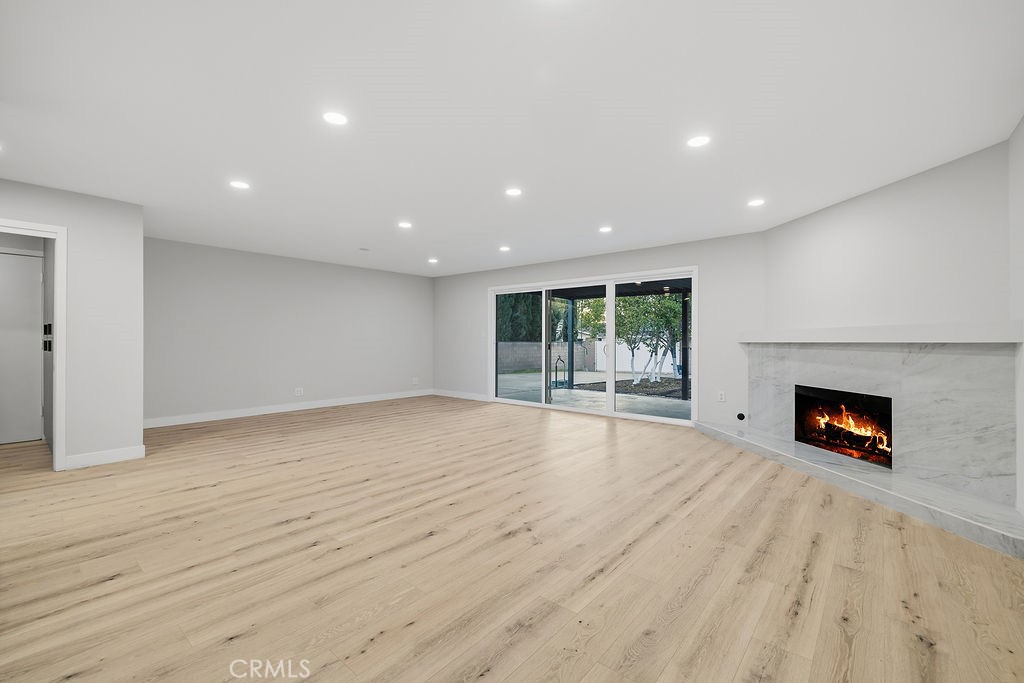 Step inside to a bright, open layout featuring new drywall, fresh paint, smooth ceilings, recessed lighting, and wide-plank German flooring throughout. The inviting living area is anchored by a gas and wood-burning fireplace with porcelain tile, while large sliding glass doors create seamless indoor-outdoor living.