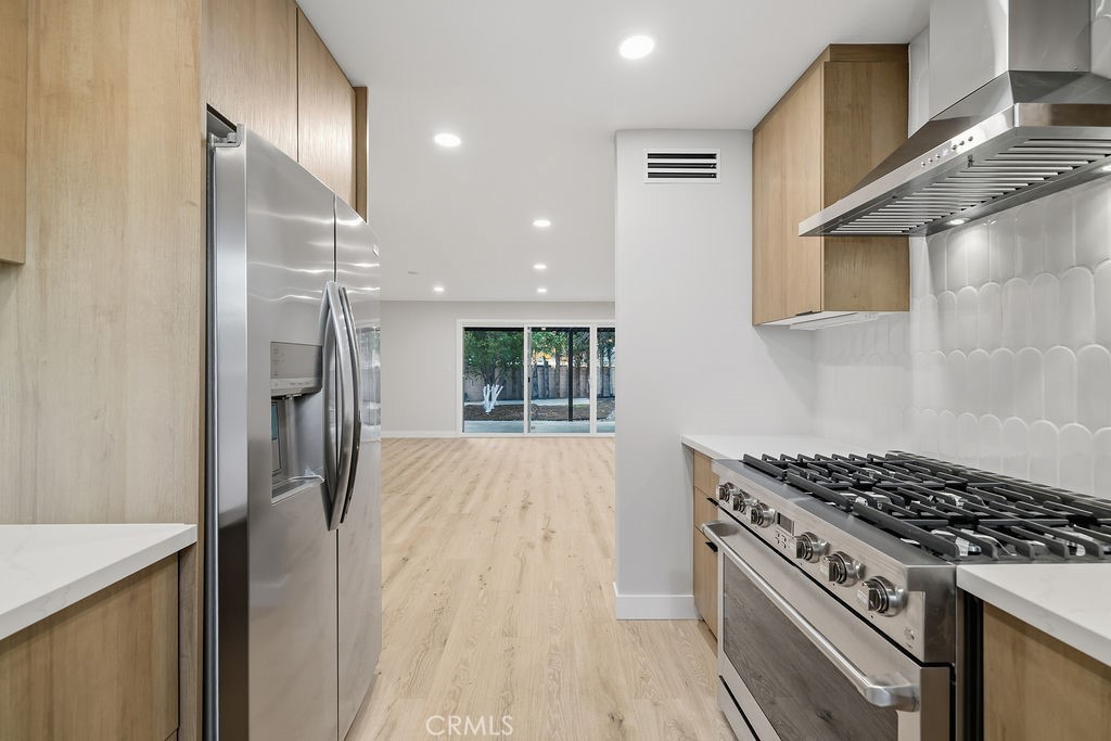 The custom-designed kitchen blends elegance and practicality with soft-close cabinetry, pantry storage, under-cabinet lighting with hidden outlets, a custom hood, 36-inch range, and all-new appliances.