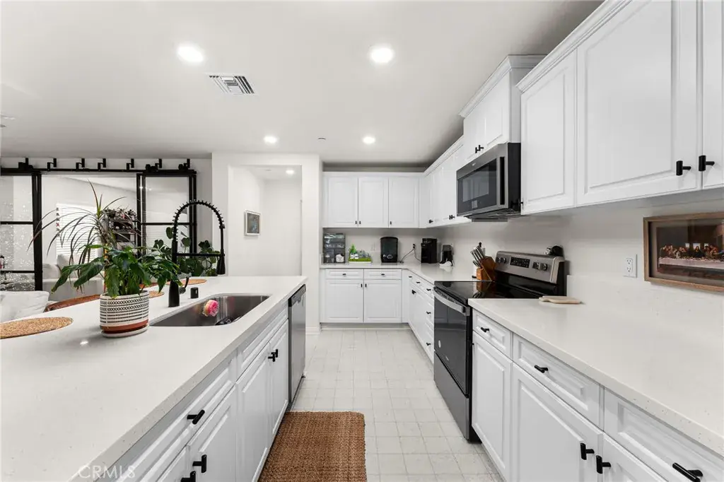 The modern white kitchen features a large center island, ample cabinetry, and flows seamlessly into the living and dining areas, creating an ideal layout for entertaining. Additional highlights include an attached 2-car garage, solar energy system for lower utility costs, and a low-maintenance design buyers love.