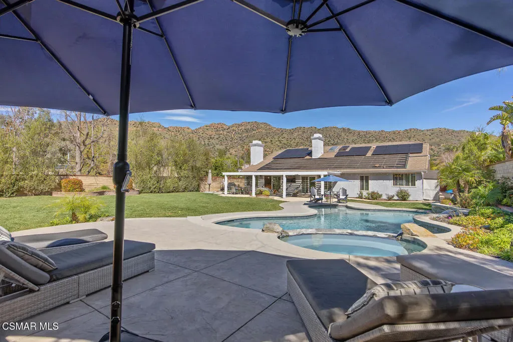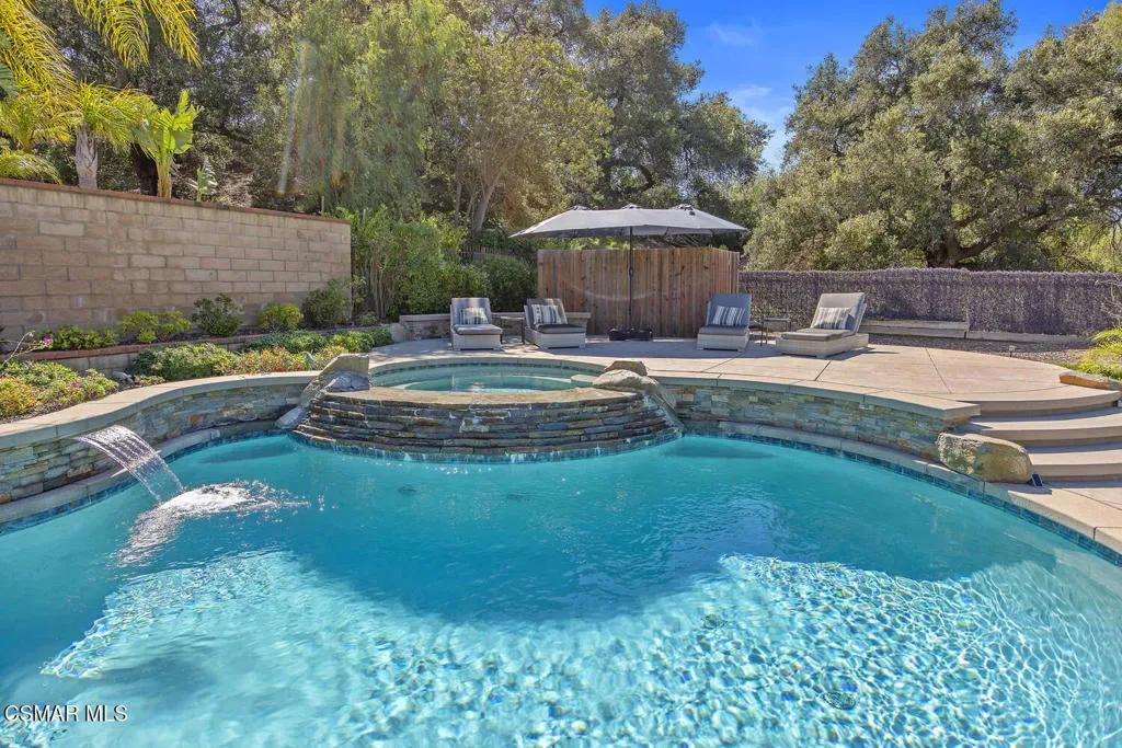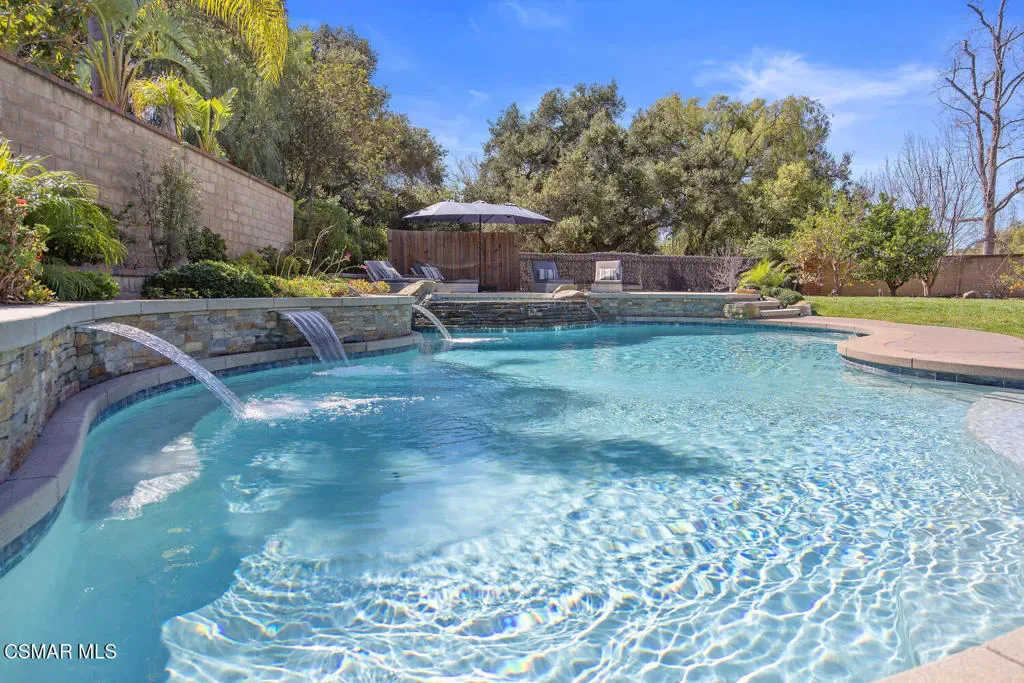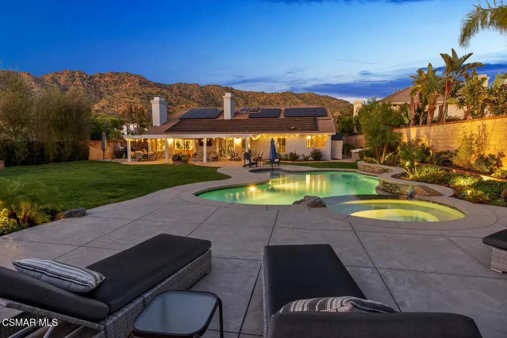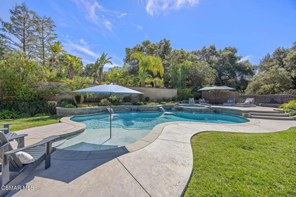 This beautifully updated one-story home in the sought after community of Sutton Valley in Oak Park on a rare almost 1/2 acre lot is truly exceptional. Starting with the curb appeal: stunning high end modern garage doors, gorgeous driveway with pavers, new drought tolerant landscaping and hard-scape, newer roof, pretty entry patio, and a new modern front door, the home is impressive from the minute you arrive. And there isn’t a better backyard in all of Oak Park. With the recently reimagined large pool and spa featuring a Baja shelf, lovely stacked stone and new tile, several waterfall features, a spacious outdoor patio for dining al fresco, a massive lawn for all kinds of fun, beautiful mountain views, several fruit trees, and a side yard with turf- the backyard is perfect for enjoying the indoor/outdoor lifestyle. With over 3,200 sq ft and 4 beds and 4 baths, the home has lots of natural light, large rooms and a terrific floorplan. The spacious living room has high ceilings and a cozy fireplace, and the gourmet kitchen features a center island with storage and seating, newer quartz countertops, custom tile backsplash, and stainless-steel appliances. The well-sized family room has a cool bar with sink for entertaining, lovely stone fireplace and sliders out to the resort-like yard. The large primary bedroom is a true retreat, with a third fireplace and sitting area, doors out to the backyard, walk-in closet, and spa-like bathroom with a dual vanity, large tub and custom tile. The repurposed atrium is an ideal space for a private office or yoga/work out room, and the 3-car garage has loads of storage, EV charger, and an epoxy floor. Located near shops and restaurants, great hiking trails, and award-winning Oak Park schools. Enjoy the best of So Cal living at your own private resort.