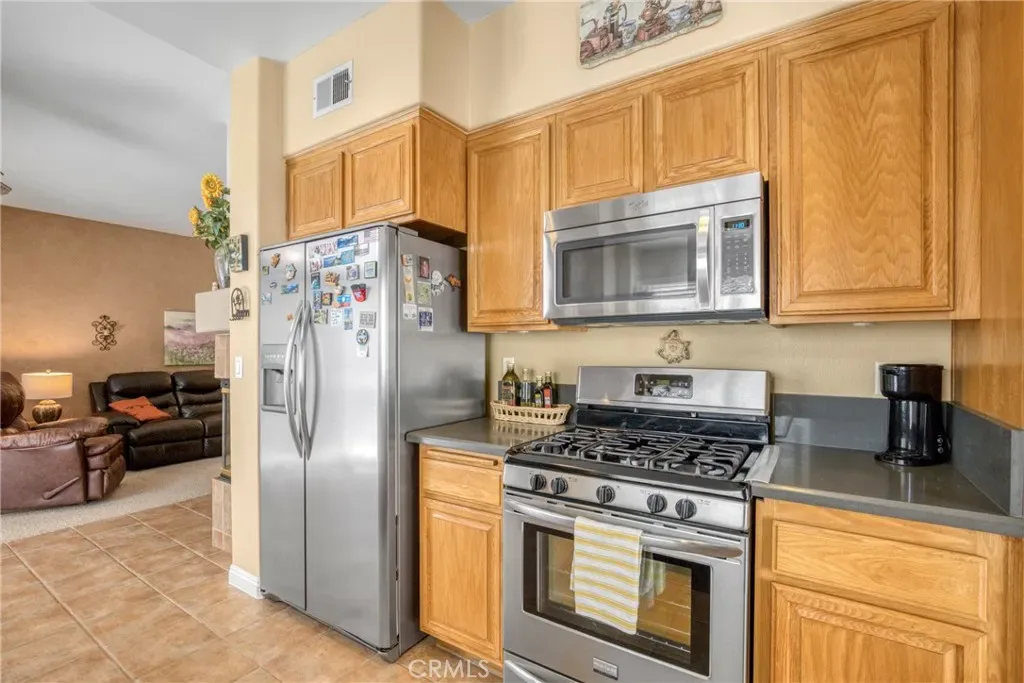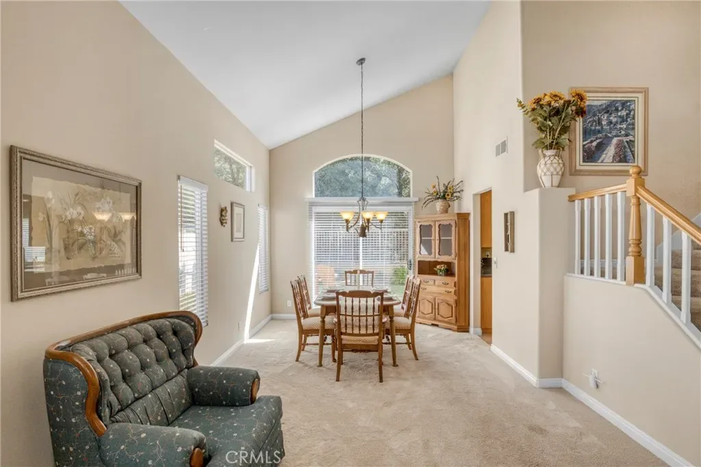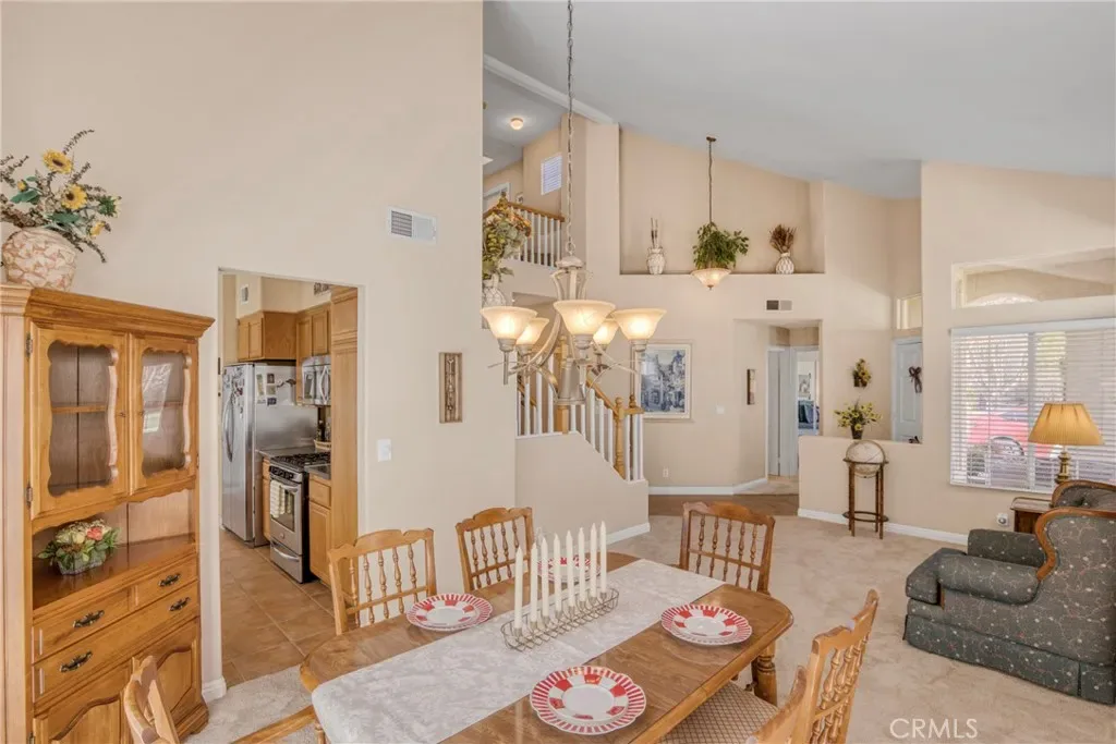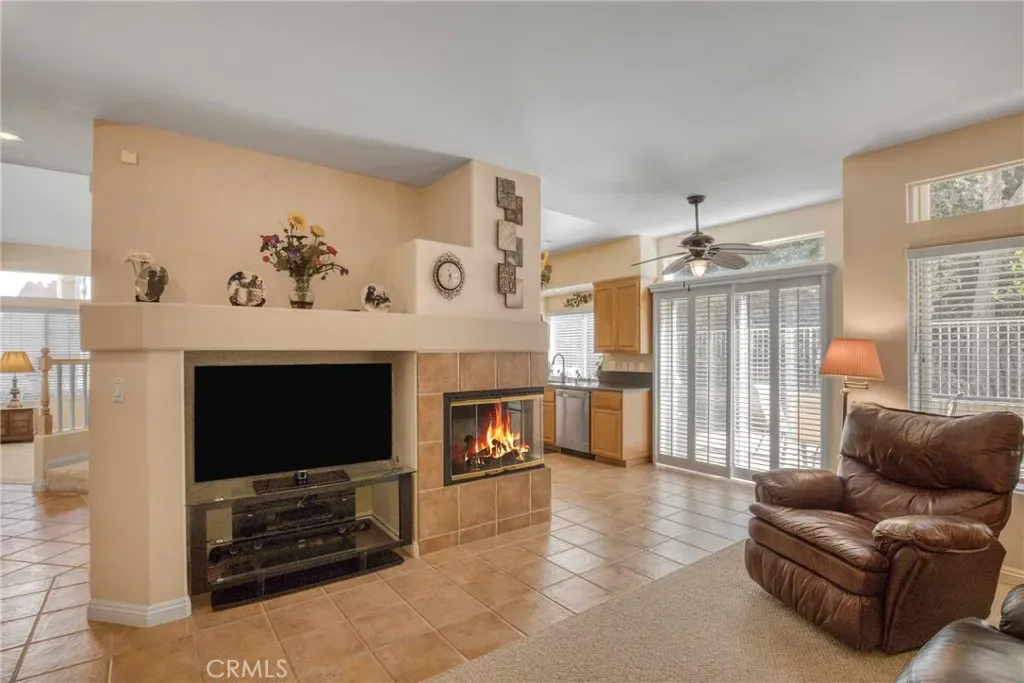 Vaulted ceilings and abundant natural light enhance the main living area, while a fireplace adds warmth and character. The kitchen features stainless steel appliances, generous cabinetry, and a dining area that creates a welcoming space for everyday living and entertaining.