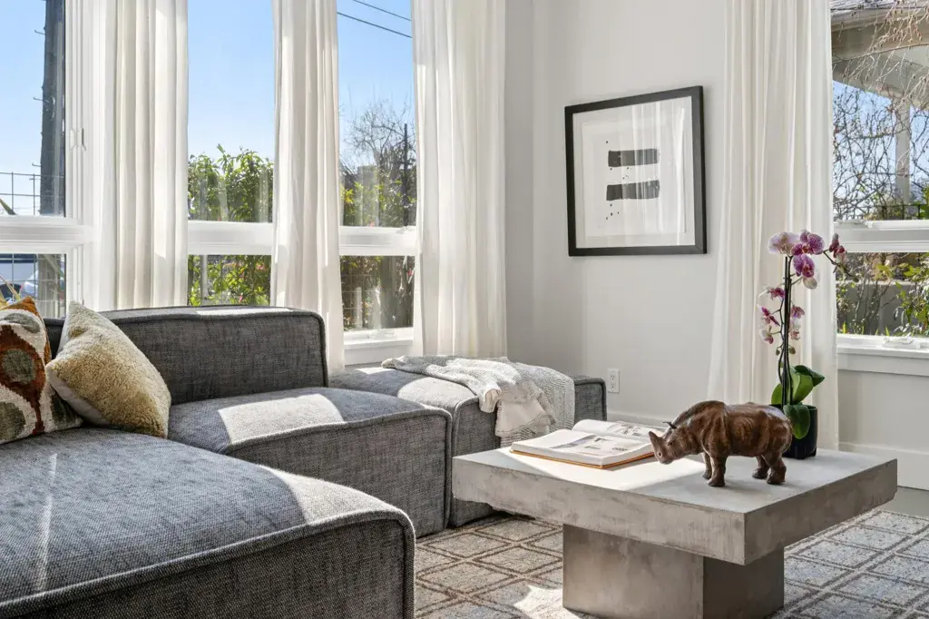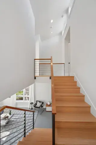 Stunning modern masterpiece set among lush gardens—a true urban oasis! Designed by award-winning architects Siegel & Strain, this 2008 custom home features innovative design and high-quality eco-friendly finishes. A dramatic foyer opens to soaring ceilings and a custom reclaimed fir–clad central core. Light-filled interiors showcase a sculptural open staircase, vaulted ceilings, and clerestory windows. The open main level offers seamless indoor-outdoor living with garden views and direct access from the kitchen and dining area to the private rear garden. Upstairs, two spacious en-suite bedrooms are separated by a bridge, each opening to charming decks. The primary suite features vaulted ceilings, garden views, private deck, wall-to-wall closets, and a spacious bath. Radiant floor heating, dual-paned wood/clad windows, off-street parking. Walk Score 89, Bike Score 84. Close to Emeryville Greenway, Berkeley Bowl West, Bay Street, dining, I-80, BART & Amtrak shuttles.