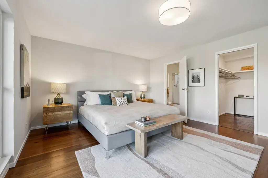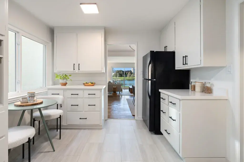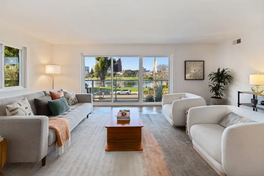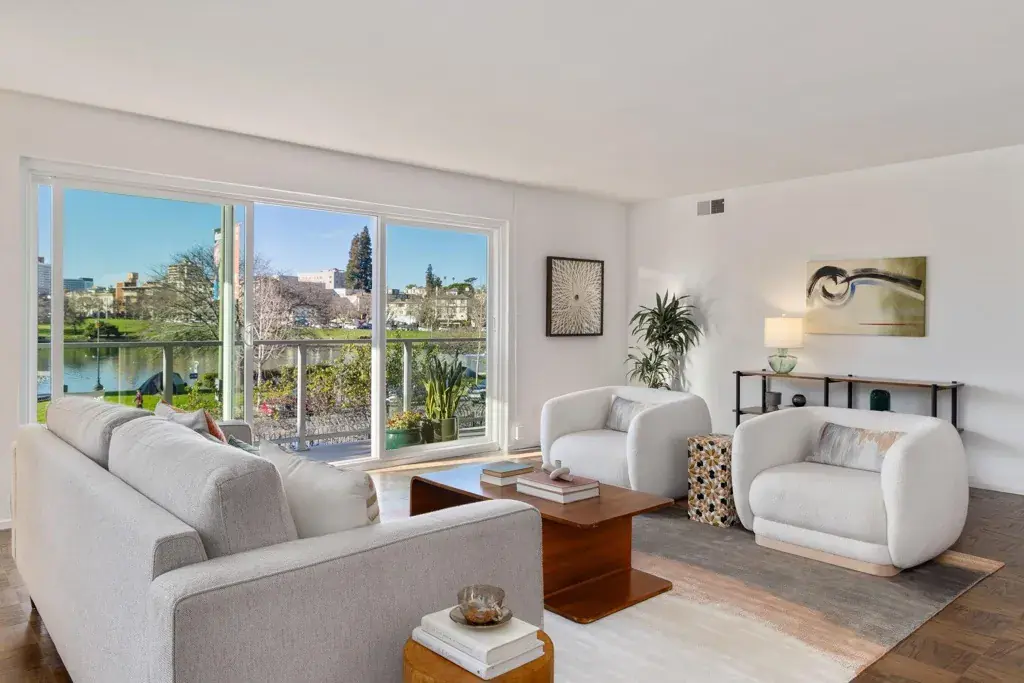 This spacious mid-century residence commands one of the most coveted positions on Lake Merritt, pairing architectural integrity with an unparalleled setting. True to its era, the home offers generous scale and clean lines. The expansive living room opens seamlessly to the dining area and balcony, where broad planes of glass frame tranquil lake views and flood the space with natural light. The updated kitchen respects the home’s modernist roots, blending sleek functionality with classic simplicity, and features new countertops and a new sink.* Both bedrooms are oversized, each with walk-in closets, while a pantry, multiple hall closets, and thoughtful upgrades throughout reflect a design that values livability as much as beauty. A rare offering at the very top of the lake.