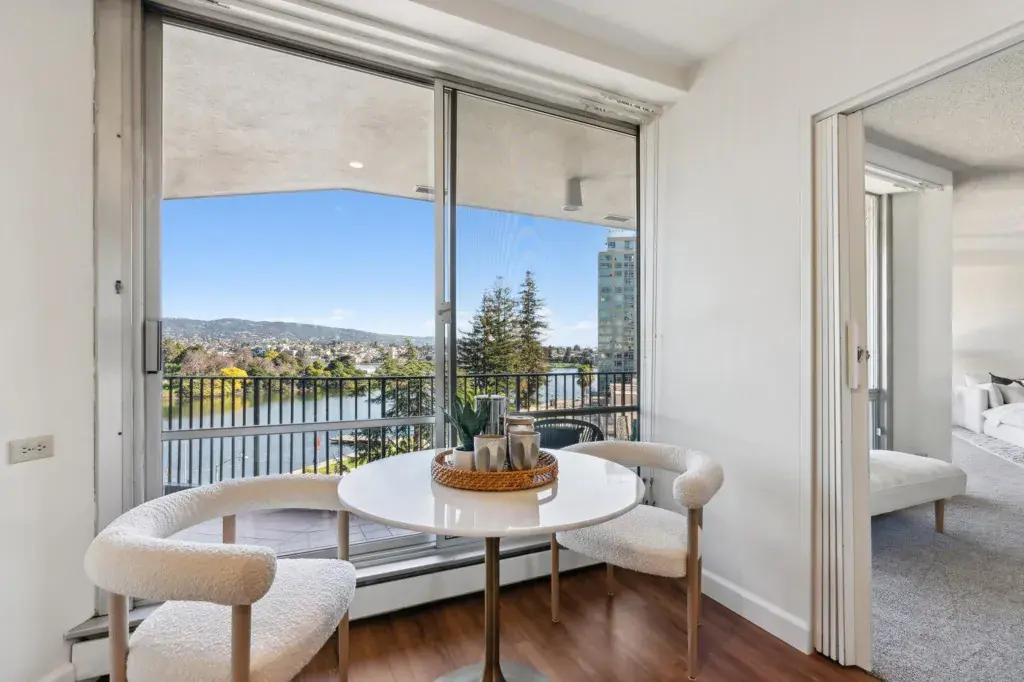 This spacious fifth floor CO-OP condo offers breathtaking, expansive views of Lake Merritt from every window, and from the long balcony that spans the length of the unit. The remodeled eat-in kitchen, fresh paint, new carpet, new modern light fixtures, and open living areas create a warm and inviting space to call home. Two spacious bedrooms have generous closets, and views, and there’s ample hall closets as well. This luxe co-op unit includes one parking space, guest parking, bicycle storage, roof-top access. Water and heat included in dues. Also included are on-site management, maintenance & custodian staff, and 24-hr front desk concierge. $19M seismic retrofit in 2019. Enjoy walks around Lake Merritt, access near to BART, bus, restaurants, museum, and the farmers market. Truly an urban luxe lifestyle. For info on Lake Royal community, visit https://www.lakeroyal.org/