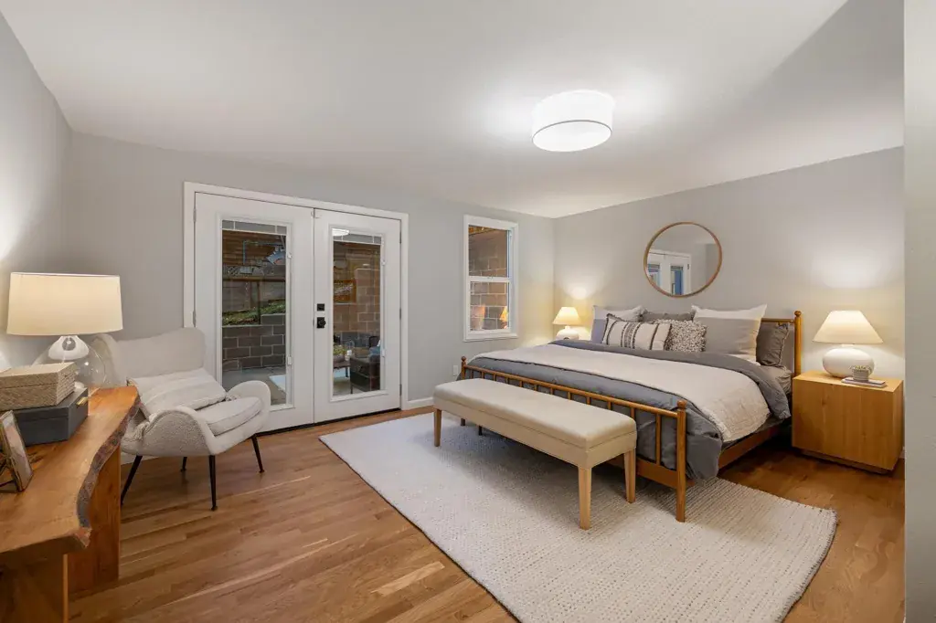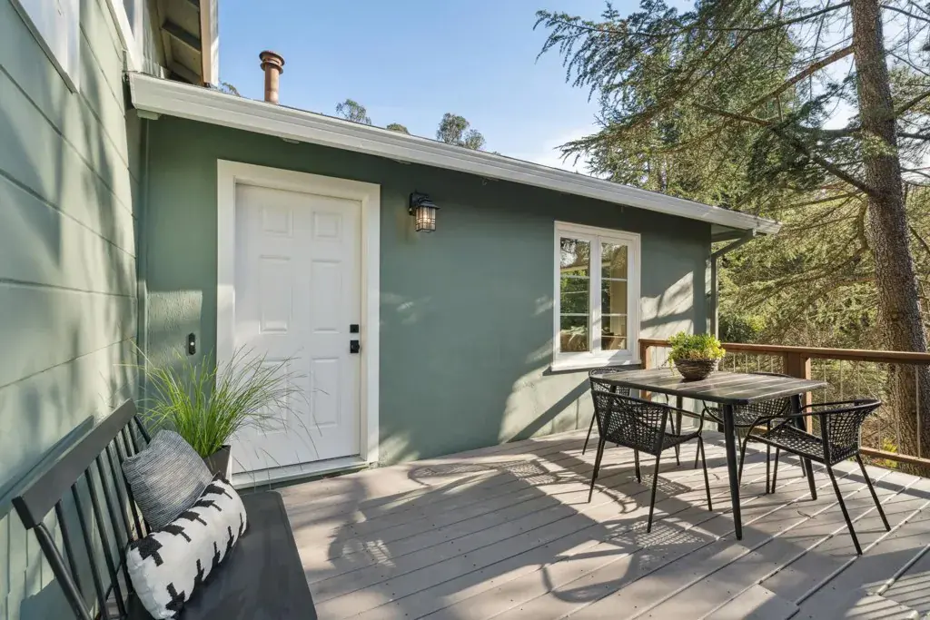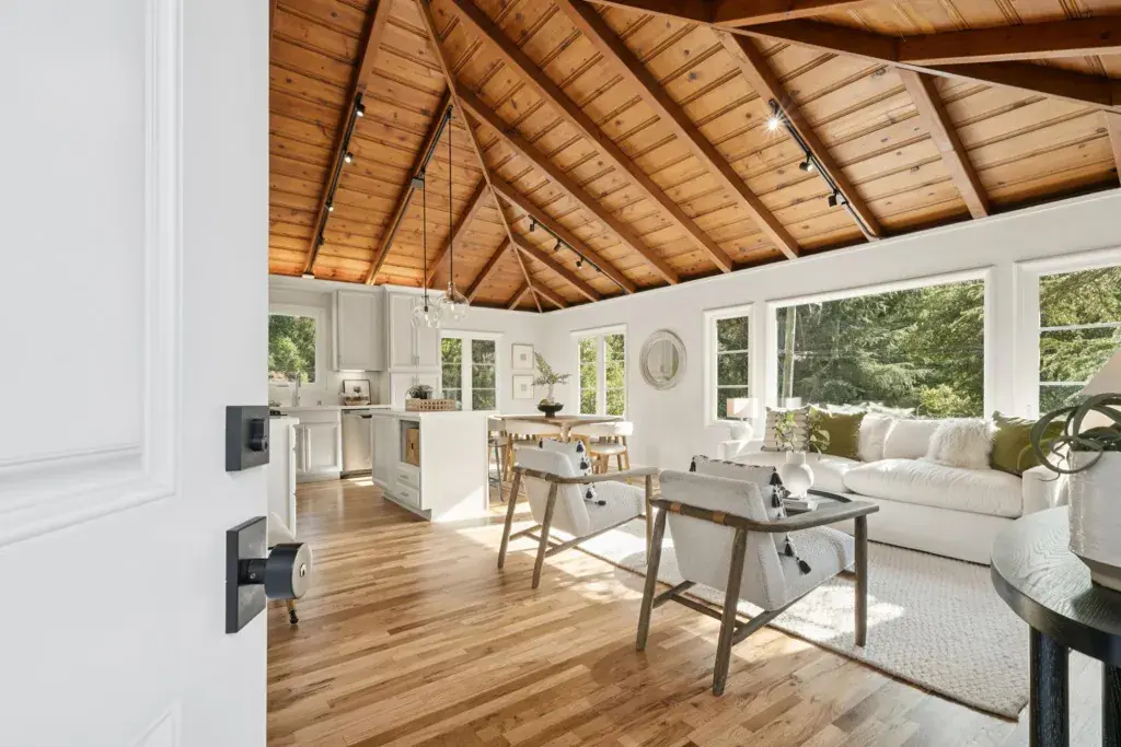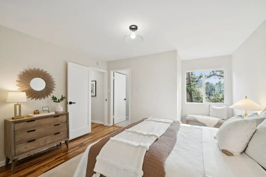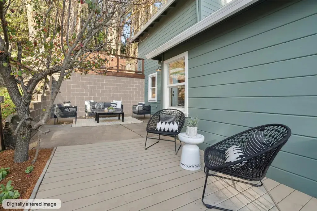 Drenched in sunlight, this sophisticated home features soaring vaulted ceilings and an open-concept floor plan for effortless California living. Antique oak floors, designer lighting, and custom railings add warmth, while nature-filled windows frame serene views. Seamless indoor-outdoor flow connects living spaces to expansive decks, perfect for entertaining. The remodeled kitchen is stylish and functional, with a large island, Caesarstone countertops and backsplash, generous cabinetry, and elegant finishes. Designer bathrooms feature contemporary vanities, designer flooring, and refined details. Four bedrooms and two baths are on one level, including a primary with French doors to a peaceful patio. The lower level offers versatile living with a separate entrance, ideal for a home office, an au pair suite, or extended family, while the upper level includes a spacious living room/den with natural beam ceilings. Mature landscaping and lovely foliage, enhances the setting, while a two-car garage with an adjacent storage room accommodates activity gear. Moments from Montclair Village—with tennis courts, parks, and a storybook library—and close to San Francisco transportation, this home is a rare urban retreat where timeless design, modern comfort, and natural beauty exist in harmony.
