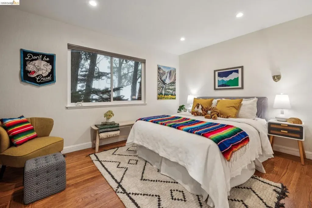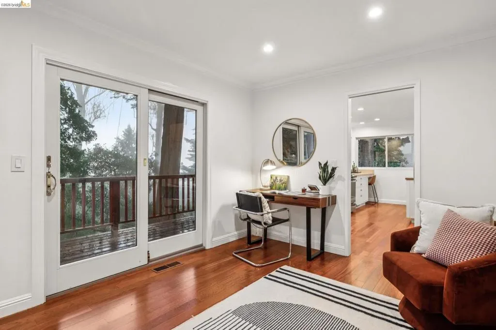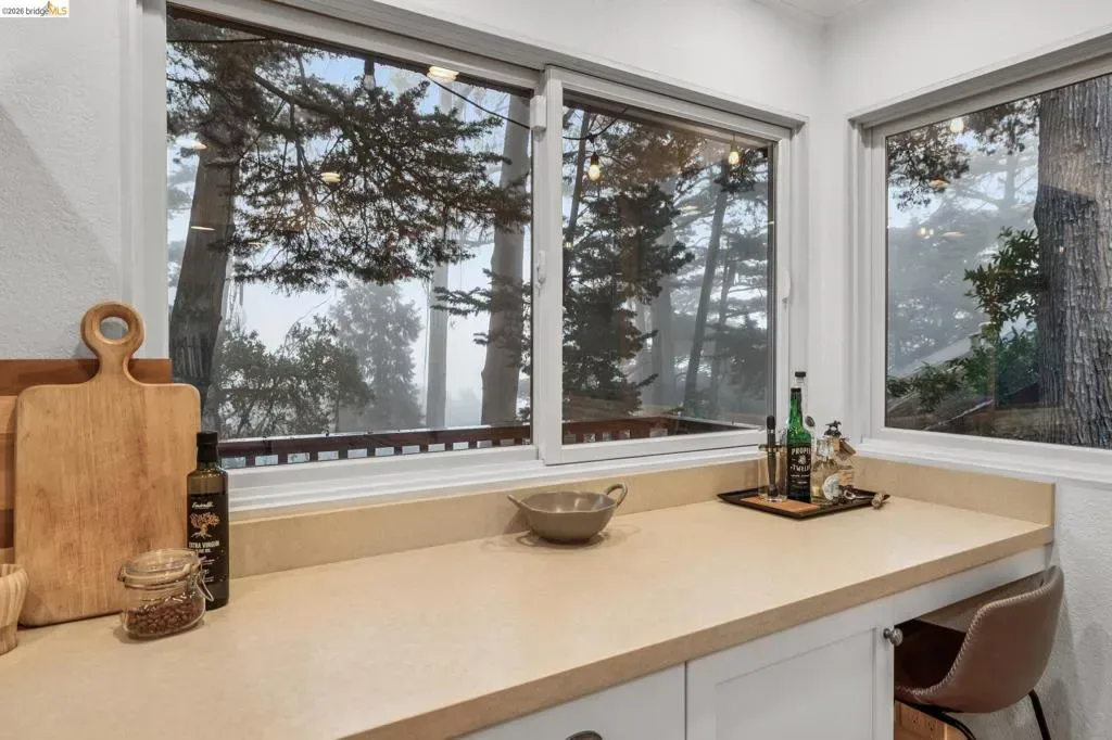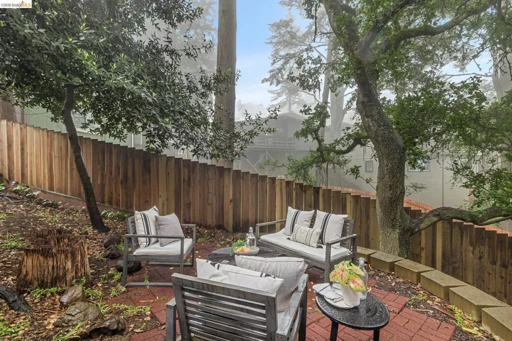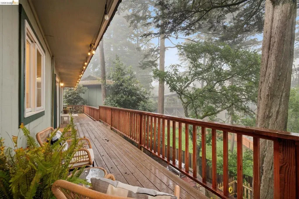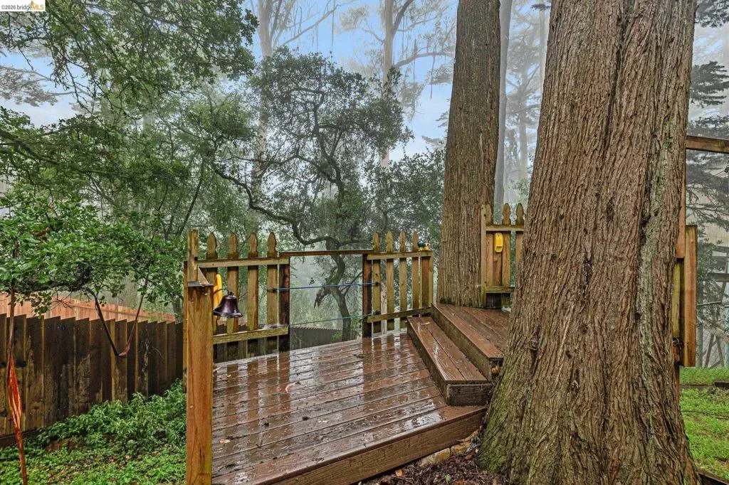 18 North Circle is a rarity in the Oakland Hills. Its situation on a large, mostly level cul-de-sac, as well as a level front yard with charming picket fence make it feel quite traditional for a hills house. The living room has a fireplace and direct access to the wrap-around deck for outdoor living. The eat-in kitchen is oversized with a large island, a pantry, and windows on three sides to let in the light. The primary bedroom has an updated marble bathroom with step-in shower and a walk-in closet. Three more bedrooms offers great flexibility. The side yard is terraced and ready for your kitchen garden, while the backyard has a patio and delightful play structure. There are contemporary upgrades like air conditioning and a tankless water heater, and extra parking for your camper or RV. Just up the street from the Hills Swim and Tennis Club, this is your tranquil home in the hills.