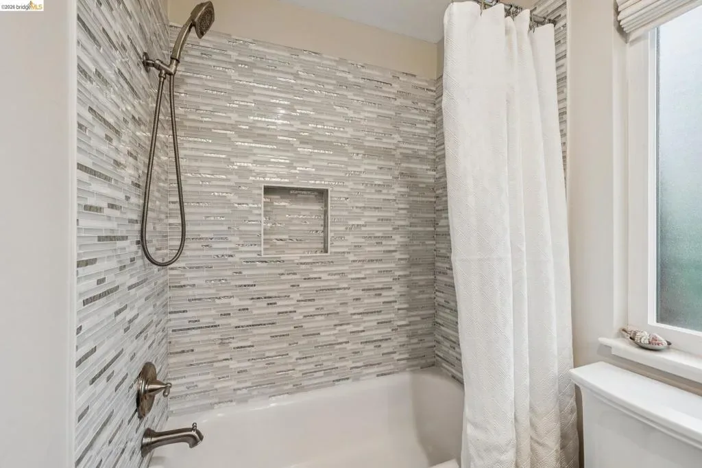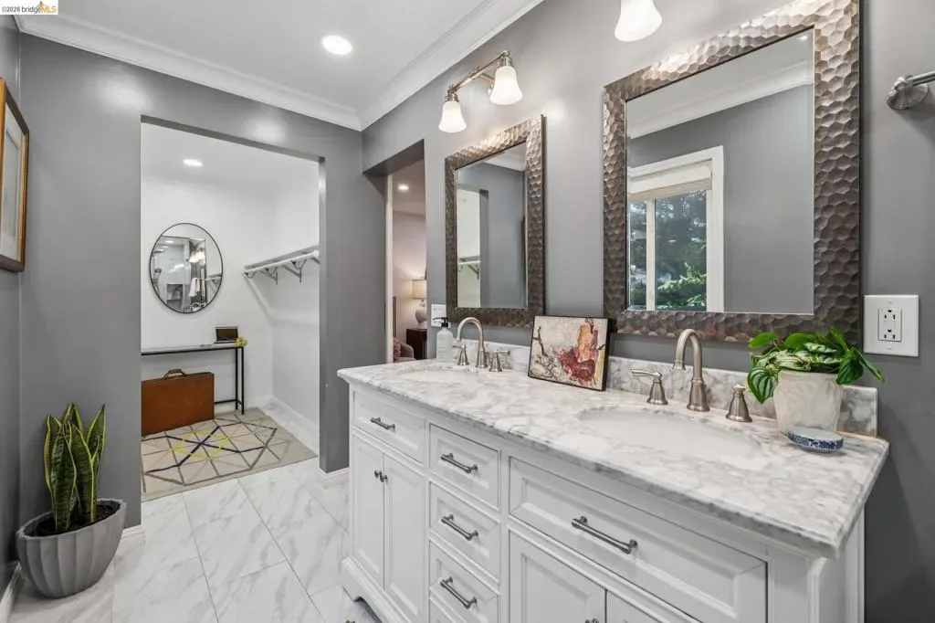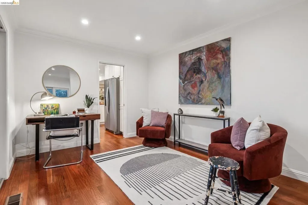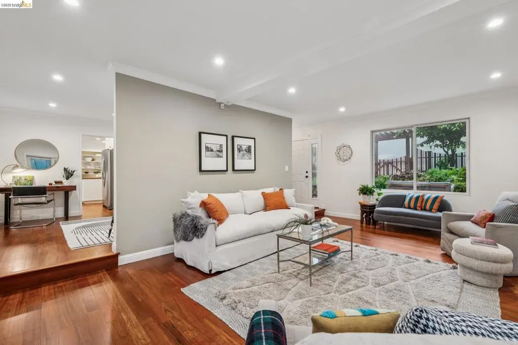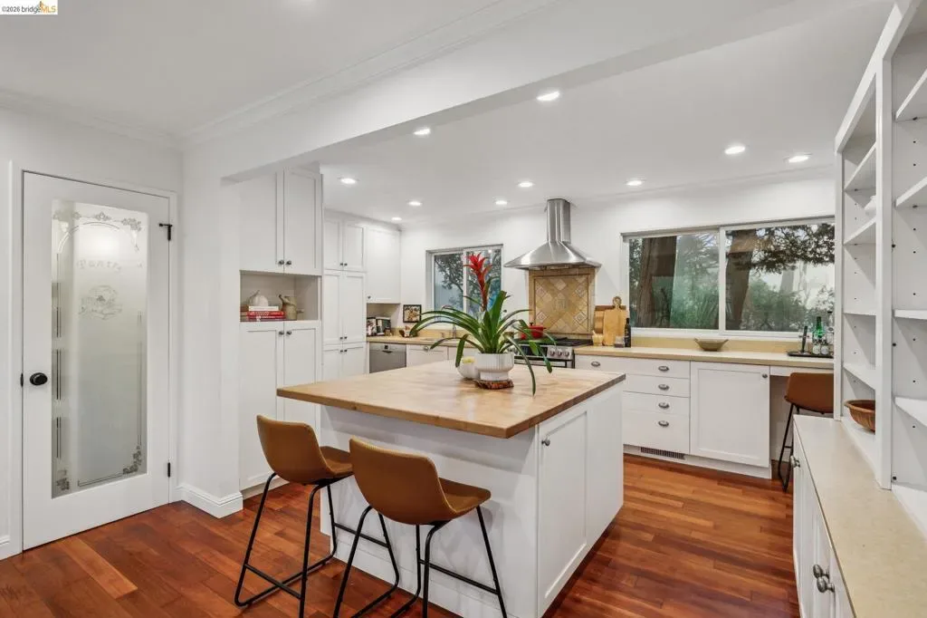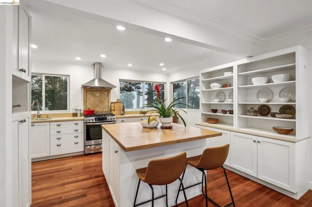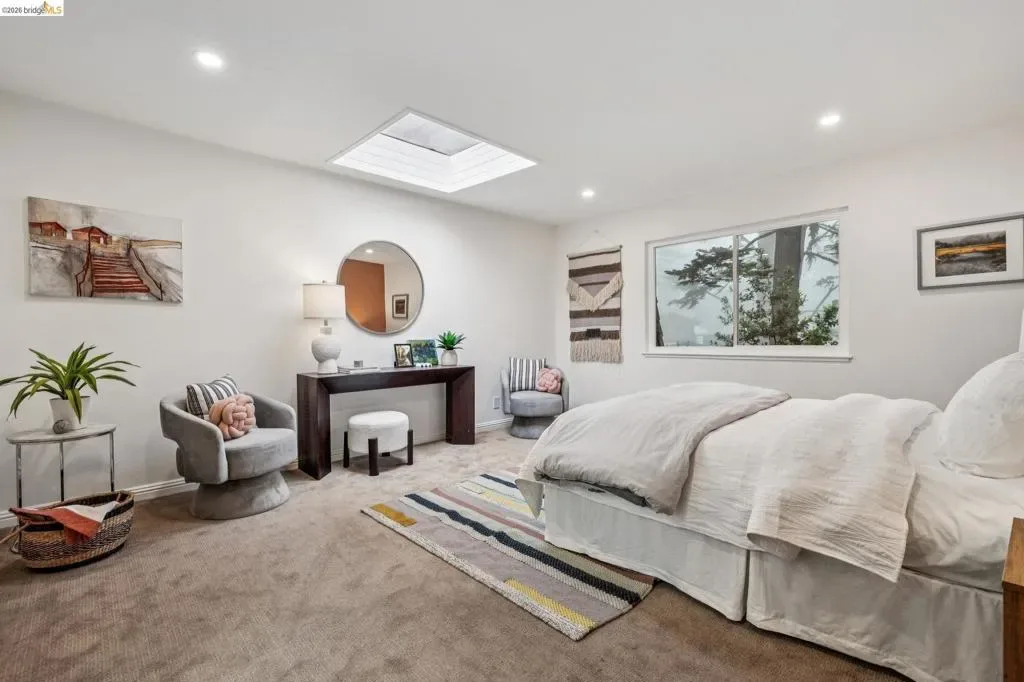 18 North Circle is a rarity in the Oakland Hills. Its situation on a large, mostly level cul-de-sac, as well as a level front yard with charming picket fence make it feel quite traditional for a hills house. The living room has a fireplace and direct access to the wrap-around deck for outdoor living. The eat-in kitchen is oversized with a large island, a pantry, and windows on three sides to let in the light. The primary bedroom has an updated marble bathroom with step-in shower and a walk-in closet. Three more bedrooms offers great flexibility. The side yard is terraced and ready for your kitchen garden, while the backyard has a patio and delightful play structure. There are contemporary upgrades like air conditioning and a tankless water heater, and extra parking for your camper or RV. Just up the street from the Hills Swim and Tennis Club, this is your tranquil home in the hills.