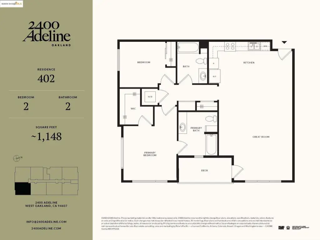 - Located in the WEST OAKLAND subdivision, 2400 Adeline ST #402 Oakland CA is a Condo for sale in Oakland, CA, 94607. It is listed for $499,000 and features 2 beds, 2 baths, and has approximately 1,148 square feet of living space, and was originally constructed in 2024. The current price per square foot is $435. The average price per square foot for Condo listings in Oakland is $483. The average listing price for Condo in Oakland is $481,332. To schedule a showing of MLS#41118055 at 2400 Adeline ST #402 in Oakland, CA, contact your James Outland agent at 8057482262.
