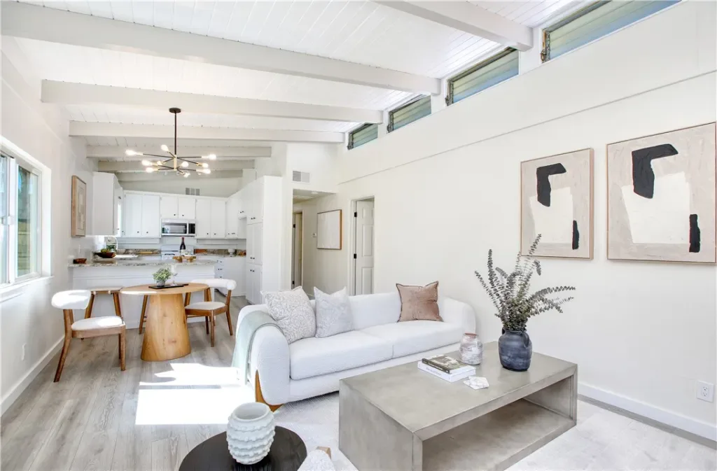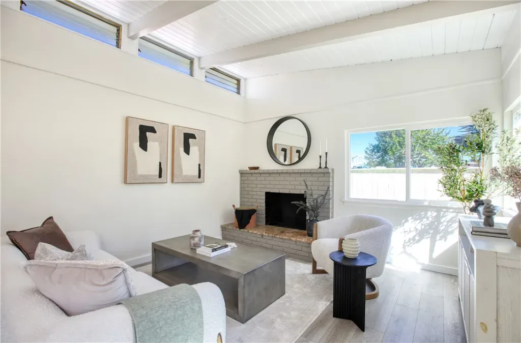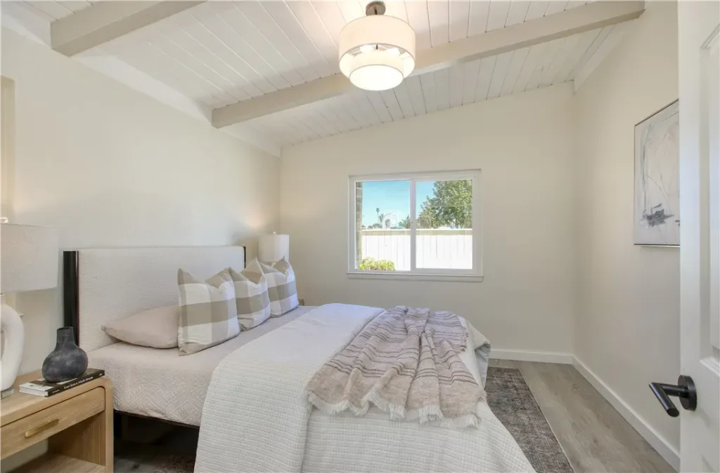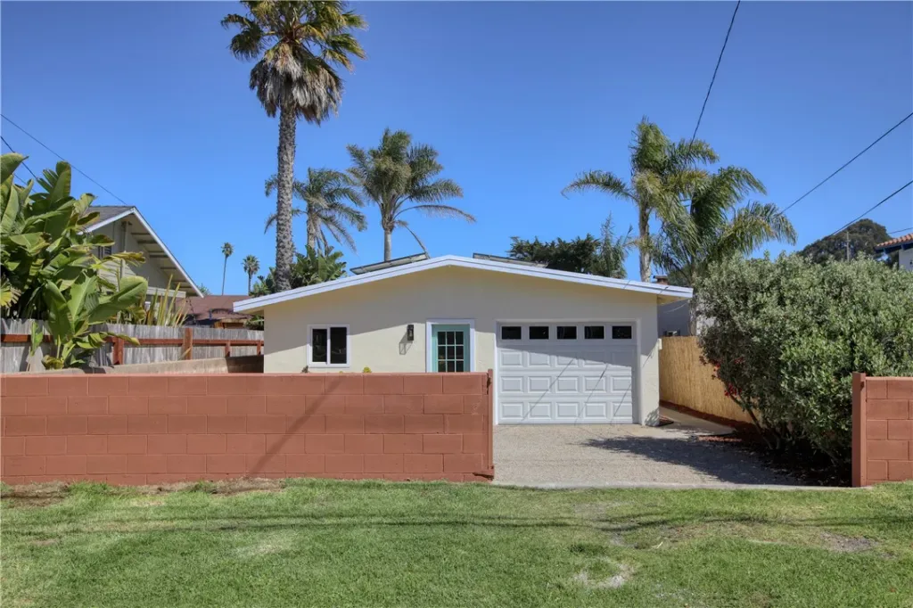 Coastal charm minutes from the sand. This freshly updated single-story home sits an eight-minute walk to the beach and directly across from a newly renovated park and playground. Step inside to open beam vaulted ceilings, clerestory windows that flood the space with light, and a painted brick fireplace anchoring the living room. The updated kitchen features granite counters, a breakfast bar, gas range, and plenty of storage. Four bedrooms and two full baths give you room to spread out. The front bedroom is en suite with park views, the hall bath has double sinks, and the rear bedroom has two generous closets and its own exterior door. Fresh paint, new laminate floors, and vinyl windows throughout. Paid-for solar panels have covered electrical usage. One-car garage with laundry hookups, 220V outlet, and extra storage; front patio and additional parking in back. Previously a successful Coastal Commission-licensed short-term rental, so your options are wide open. Move in, earn income, or do a little of both. This one checks all the boxes.