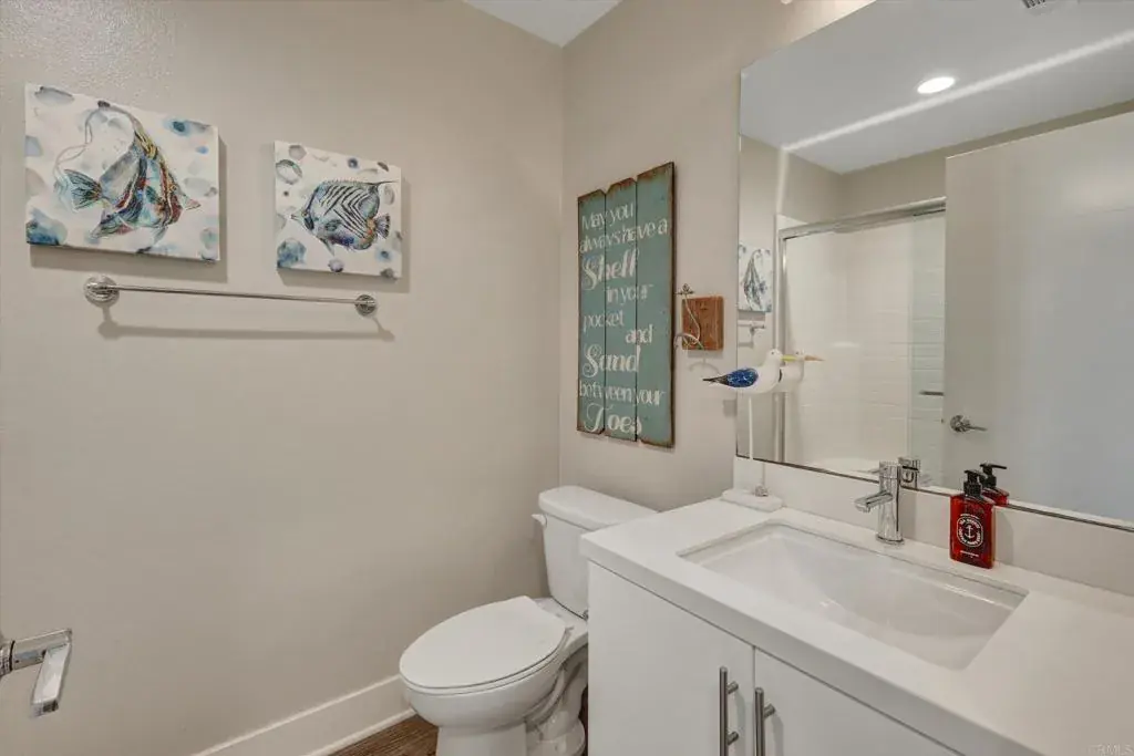 Incredible OCEAN VIEWS and a Private ROOFTOP DECK – RARE 5Bed/4Ba end unit, 2,556 sq ft. 2 Car Garage with LARGE private expansive rooftop deck with SUNSET views. Special financing (1st yr approx 3.4% interest rate) is possible on this home. Seller will consider Option to purchase completely furnished. 2018 construction, located in highly sought-after Vista Del Mar community off Pacific Coast Hwy, just a short 5 min walk to BEACH on Oceanside/Carlsbad border. Beautifully decorated, Meticulously upgraded Tri-Level Townhome… Open concept Kitchen/Family room features shiplap, beamed ceilings, custom lighting, upgraded cabinetry, quartz counters with waterfall edge island, stainless appliances, large breakfast bar & eat-in nook, custom window coverings & woodworking with upgraded flooring throughout. Multi-level outdoor deck space, French doors. Professionally decorated. 1st Floor: One Bedroom & Bath, living room/office/exercise area, garage access – 2nd floor: Kitchen/Family room, Guest Bedroom & Bath, coffee bar – 3rd floor: Primary Bedroom & Bath, 2 secondary Bedrooms & Bath with laundry. 4th level: roof top deck. The super sized Primary Bedroom has a gorgeous bath: Tile flooring, lighting, large walk-in shower, a double vanity and quartz countertops dual sinks & huge walk-in closet with access to rooftop deck. Private Association amenities include a resort-like Swimming Pool/Spa/BBQ area. Quiet location, property is conveniently located next to Oceanside/Carlsbad beaches, restaurants, grocery stores & major freeways 5/78/76. A short bike ride to the Carlsbad Village or Downtown Oceanside restaurants, cafes, shopping, and the train station. You MUST SEE this home. Don’t miss this opportunity to own a newly constructed and upgraded home in an exceptional coastal location.