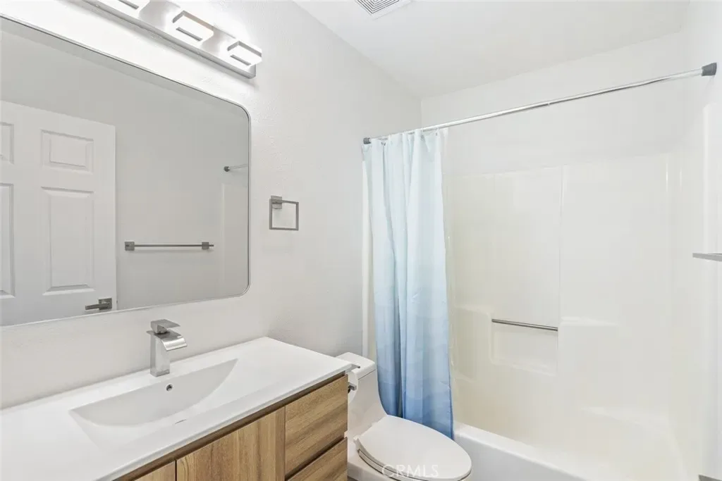The front bathroom has been stylishly updated with a modern vanity, lighted mirror, new fixtures, and brushed nickel finishes.