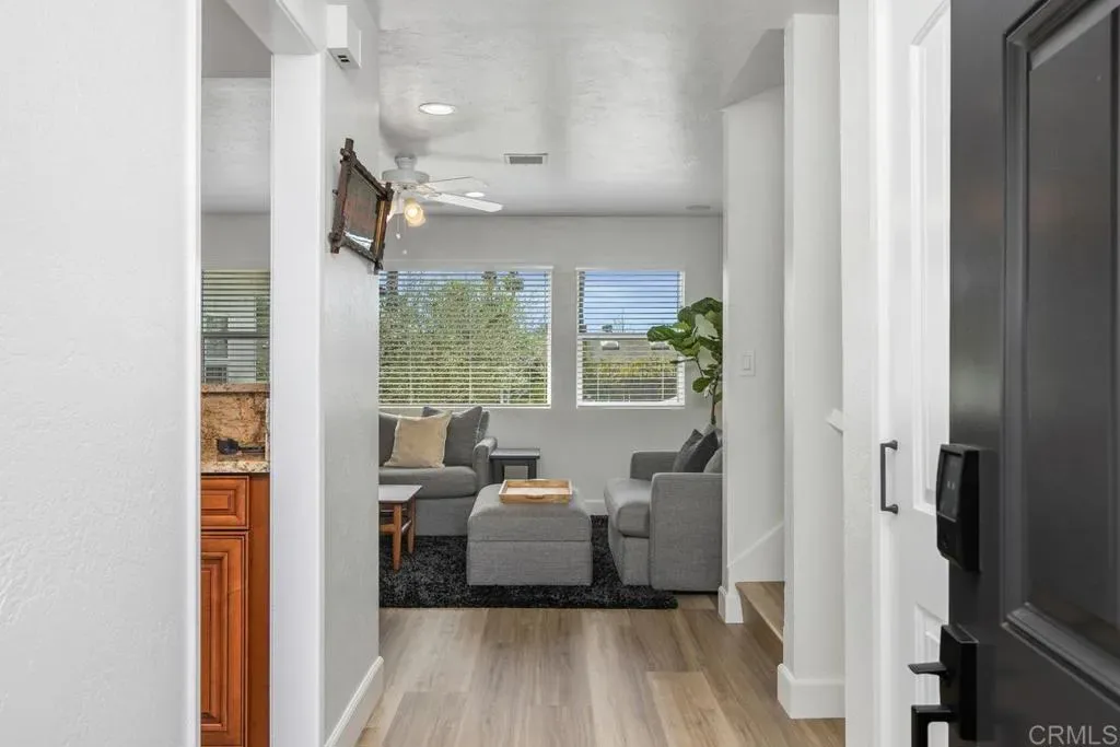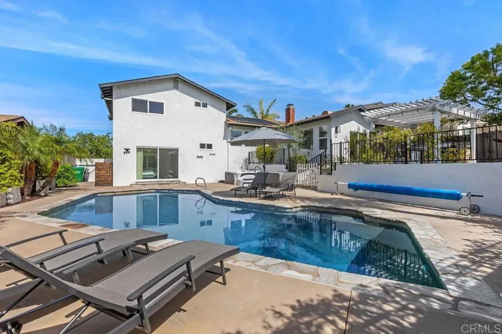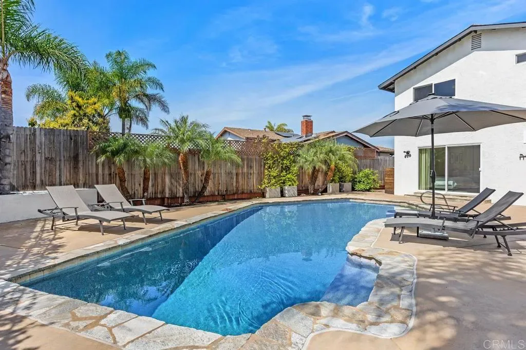 Enjoy relaxed coastal living in this beautifully updated, very private home featuring a resort-style backyard with a pool, spa, owned solar, ocean views, and no HOA. The main living spaces feel open and inviting with luxury vinyl plank flooring throughout and an easy flow between the kitchen, dining, and living areas. The living room offers a fireplace and surround sound, while the kitchen is equipped with granite countertops, stainless steel appliances, and bar seating that connects comfortably to the living space. The adjacent family room opens with a sliding door to the yard, where the BBQ island and patio overlook the pool creating a seamless indoor-outdoor connection ideal for entertaining. Remodeled half bath completes the main level. Upstairs offers three bedrooms and two updated bathrooms. Two bedrooms share a Jack-and-Jill bath, while the third is served by a separate hall bathroom. Two of the bedrooms open to a spacious deck where you can enjoy mountain and ocean views on clear days. The primary suite provides a private retreat with direct access to the backyard and pool, along with a beautifully remodeled bathroom featuring dual sinks and a walk-in shower. The backyard is designed for both relaxing and entertaining with a multi-level layout, pool and spa, and a covered patio with a BBQ island, all surrounded by mature landscaping. The pool includes a pebble finish, saltwater system, recently replaced pool vacuum, and solar heating. Additional improvements and features include owned solar, air conditioning, newer windows, interior and exterior paint, updated blinds, a closet organizer in the primary bedroom, ceiling fans in all bedrooms, a Ring doorbell, an Ecobee thermostat, a whole-house fan, updated fixtures, epoxy garage flooring with built-in storage, modern garage door and a finished storage area beneath the home. Conveniently located near parks, shopping, schools, and a short drive to the beach.