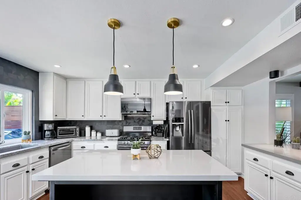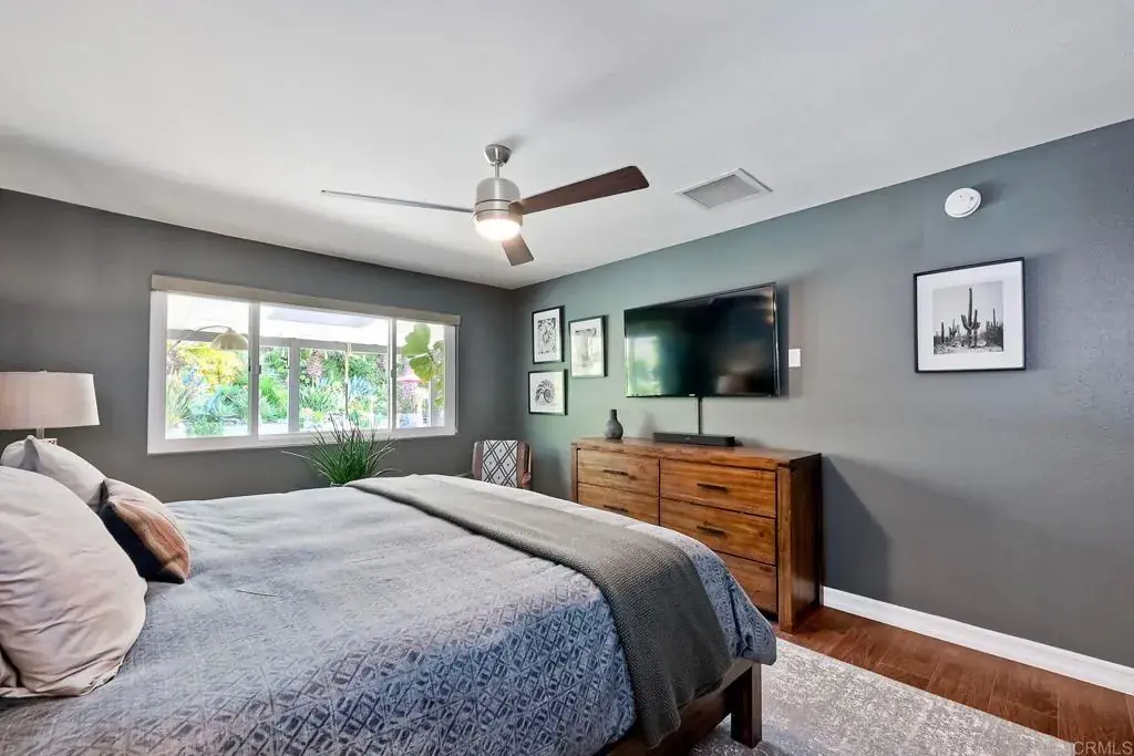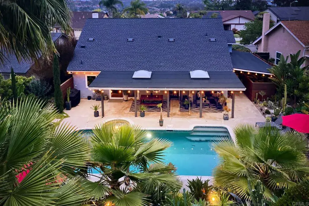 A playful yet refined coastal retreat just five miles from the beach in Oceanside – San Diego’s newest vacation destination. Designed to live like a single story, this beautifully remodeled home blends everyday comfort with a relaxed, getaway-inspired vibe. From the moment you arrive, custom drought-tolerant landscaping and designer details set the tone for effortless coastal living. The expansive backyard is an entertainer’s dream, featuring a sparkling pool and spa finished in mini pebble tec, a large covered patio with skylights, and ample space to relax, gather, or expand. No HOA adds flexibility and freedom, while a very private primary suite on the entry level enhances livability and privacy. Completely remodeled from top to bottom, this move-in-ready home showcases luxury vinyl plank flooring throughout, newer windows and sliders, and high-end wooden shutters that elevate both style and function. The spacious kitchen features granite counters and opens seamlessly to the great room and dining area, accented by tasteful tile feature walls and designer finishes. Two and a half custom baths include gorgeous tile floors, custom vanities with granite counters, and soft-close drawers. An entry-level bedroom currently staged as an office offers flexible use as a dining room or bedroom, while upstairs guest bedrooms feature vaulted ceilings and a cozy loft ideal for reading or relaxing. Major system upgrades include a roof replaced in 2023, newer furnace, and newer water heater, offering peace of mind for years to come. Additional highlights include a whole-house fan including the garage, abundant attic storage, and a three-car garage with stylish accent doors. Ideally located near shopping, beautiful beaches, and easy freeway access, this immaculate home delivers a lifestyle that feels like a vacation while remaining perfectly suited for full-time living.